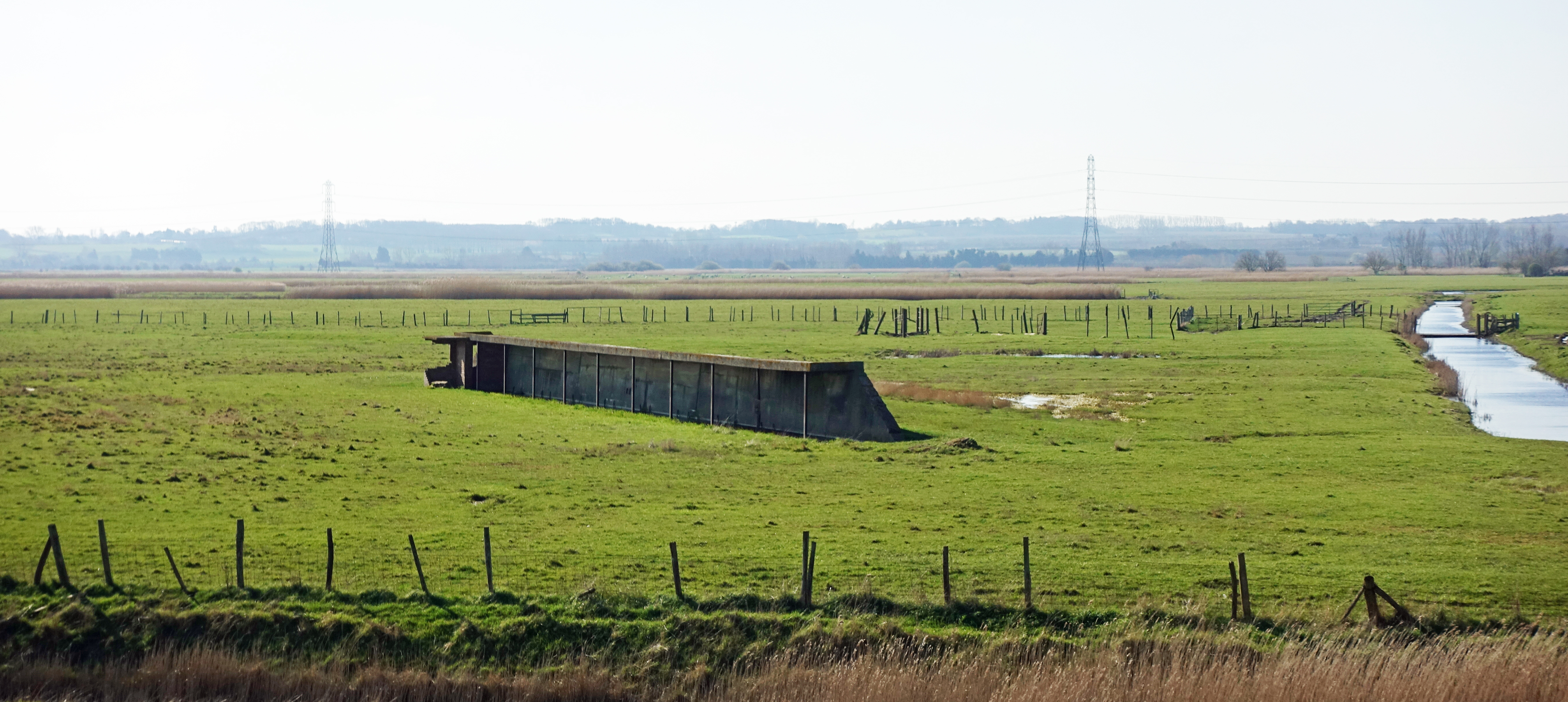 Two wartime rifle ranges are passed on this walk. The crumbling concrete butts are simply part of the grazing marsh landscape today