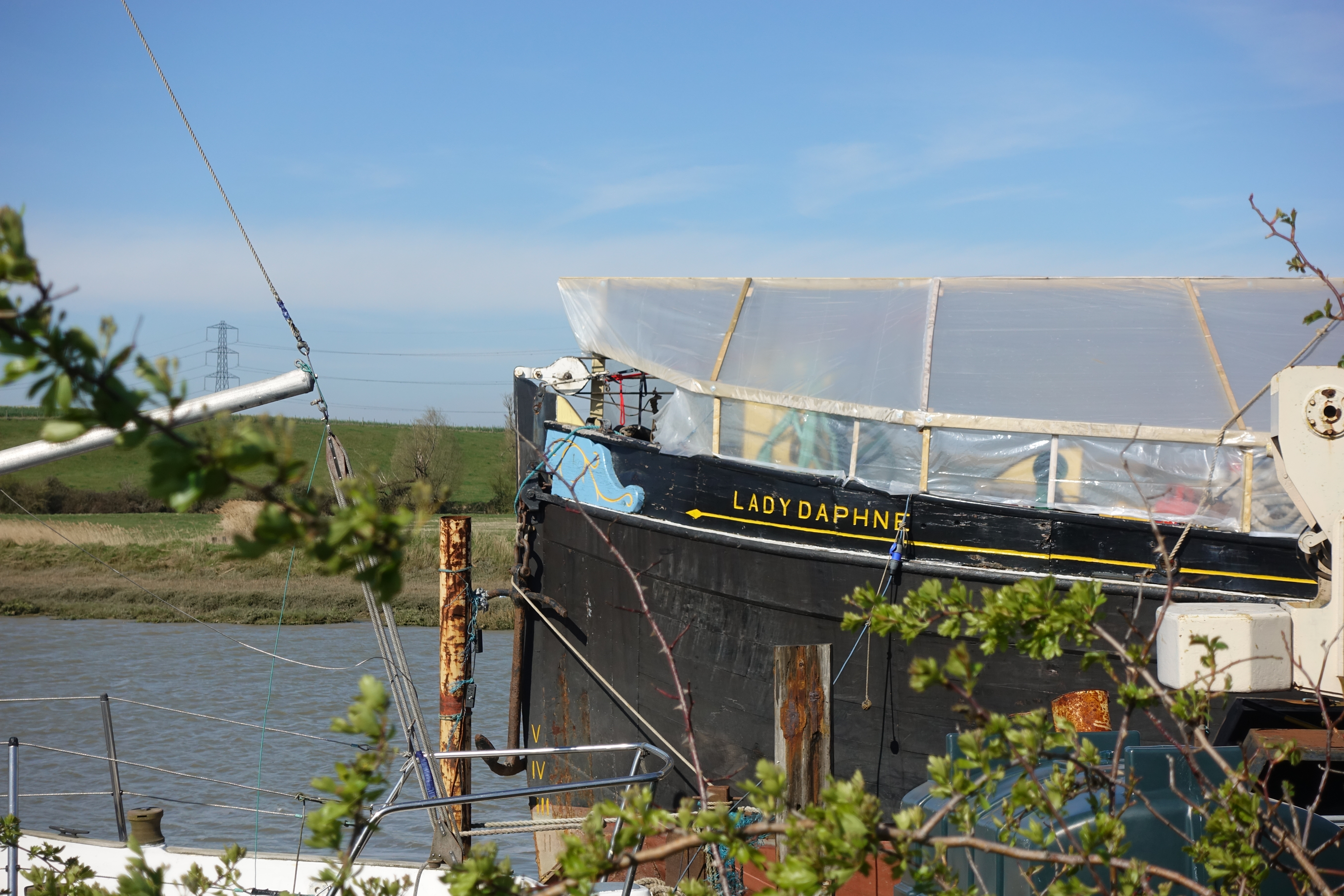 Lady Daphne in Oare Creek, Faversham. Now derigged and covered, she is undergoing maintenance, cleaning, repair and repainting prior to sailing through Tower Bridge in London in 2021 to commemorate Sir Ernest Shackleton setting sail to the Antarctic 100 years previous. She is a Thames Barge built by Short Brothers in 1921, one of the few wooden barges built following the Great War