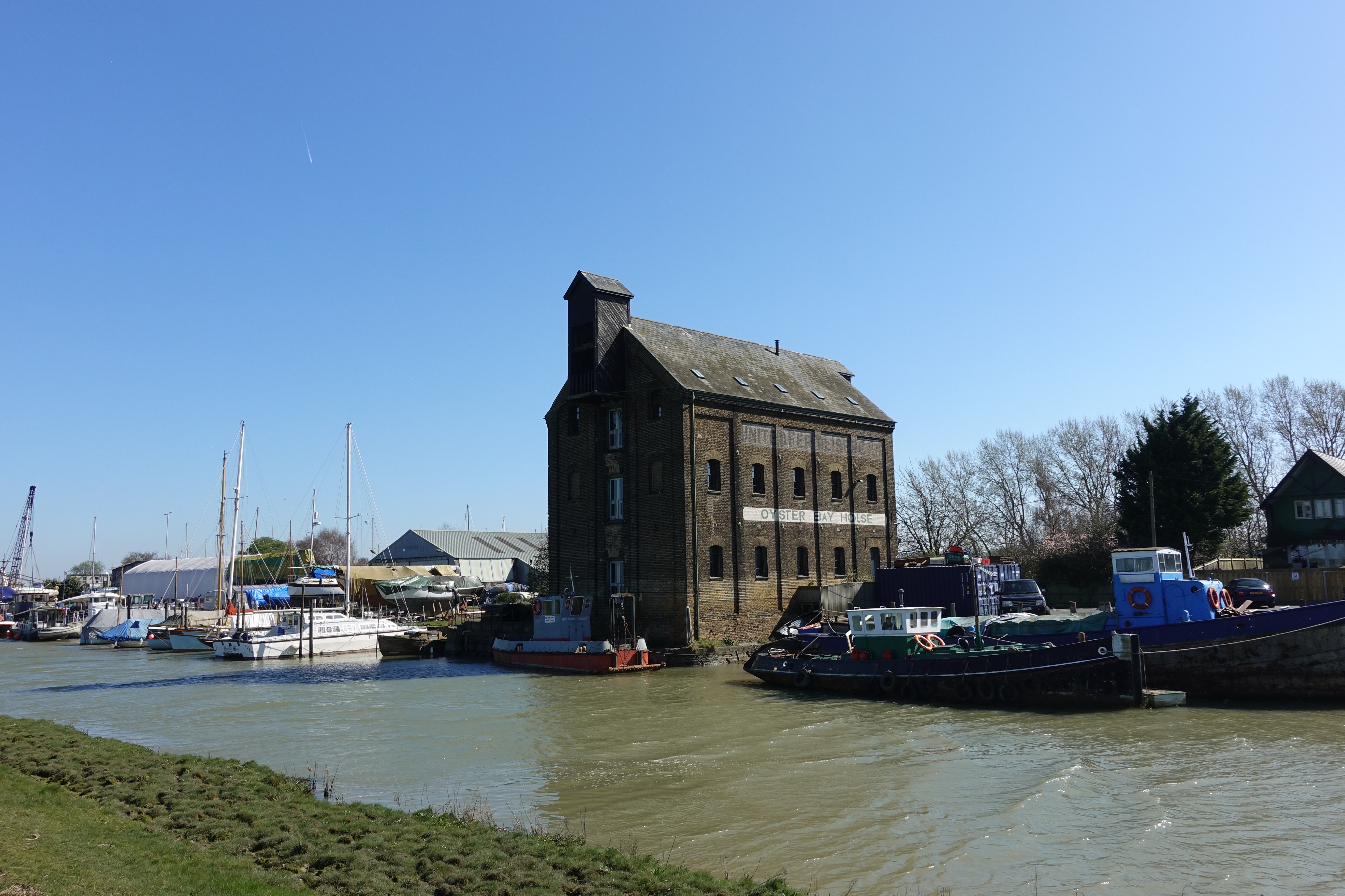 Oyster Bay House. Approaching Faversham via the tidal Faversham Creek, the trail passes opposite the mid-nineteenth century warehouse. Locally known as the ‘Big Building’, it once stored hops from the hop gardens of Kent, destined to the London brewers, transported by sailing barge
