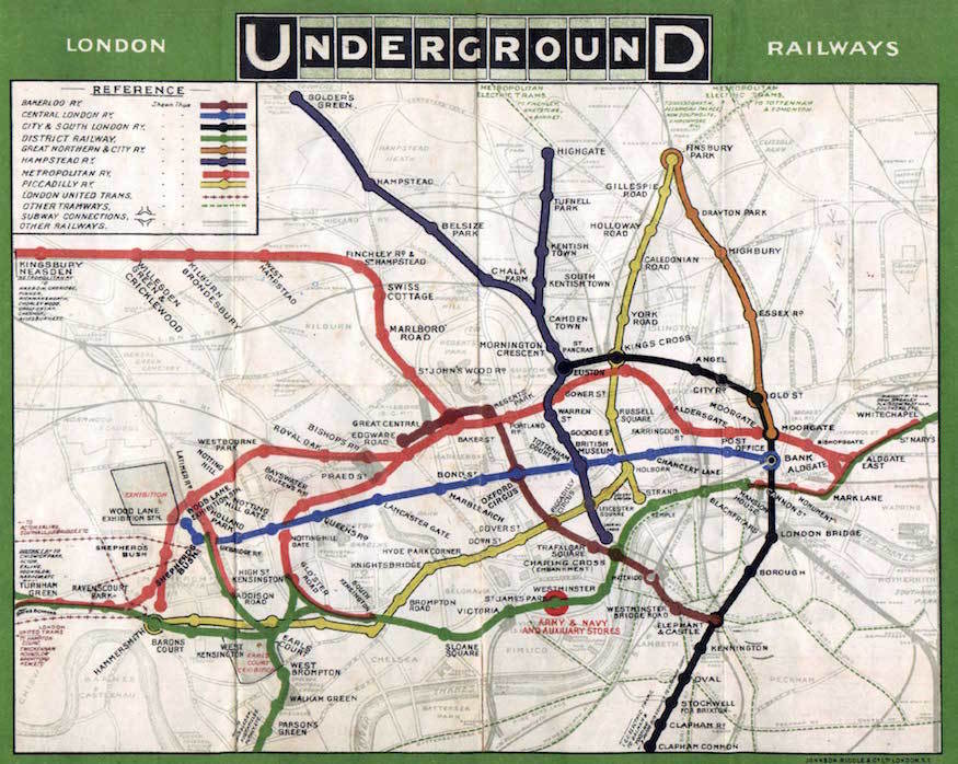 The first maps of the London Underground system had normal street maps and the lines of the underground railways superimposed. This was replaced in 1921 with a tube network map with above ground detail other than stations and the River Thames omitted. This was more than adequate for underground rail travellers but obviously of no use to those walking above ground.