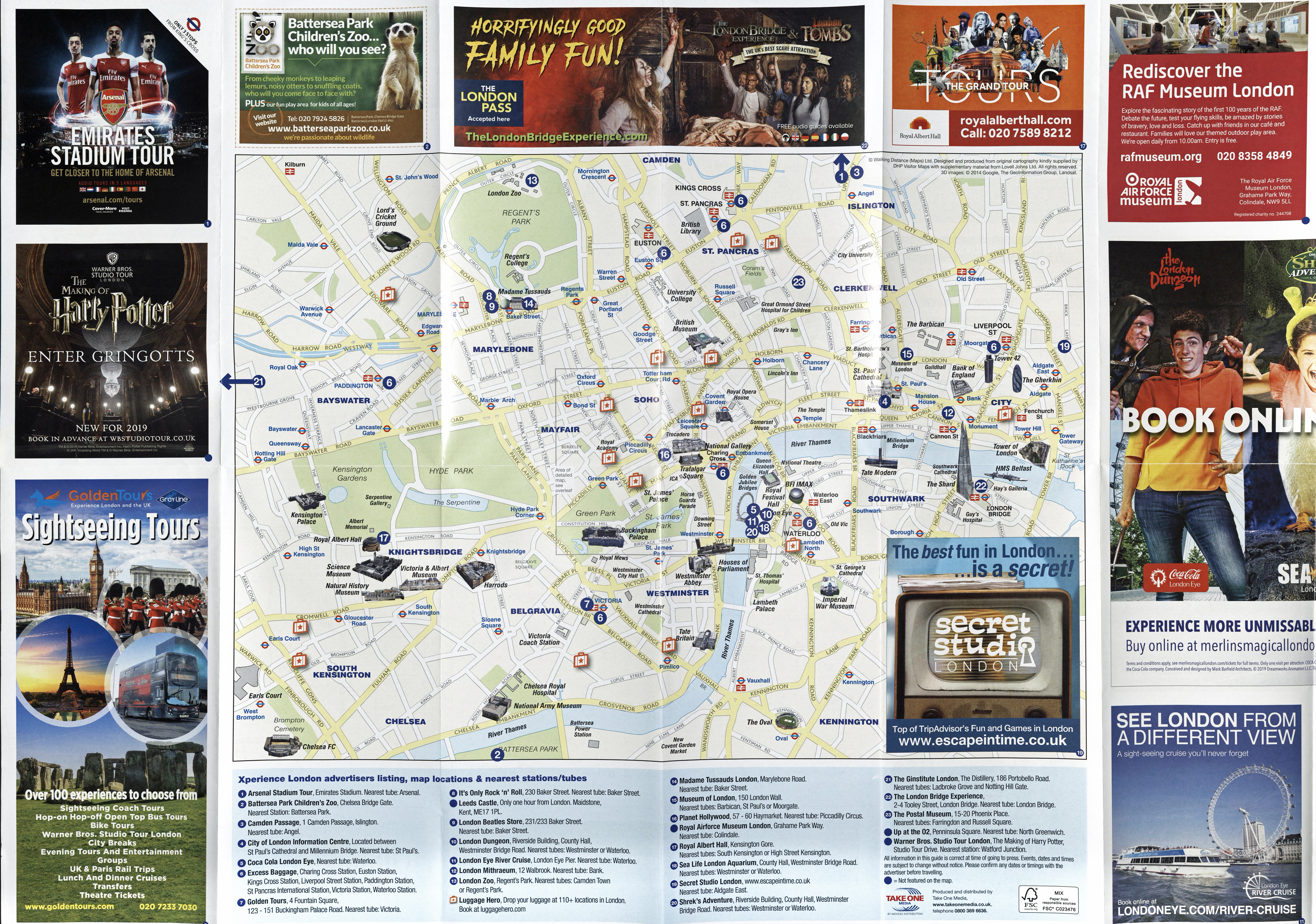 Experience London Tourist map. Freely distributed, the majority of the sheet is taken up with advertising various attractions with just about sufficient information on the map itself to enable tourists to travel between them. 2018