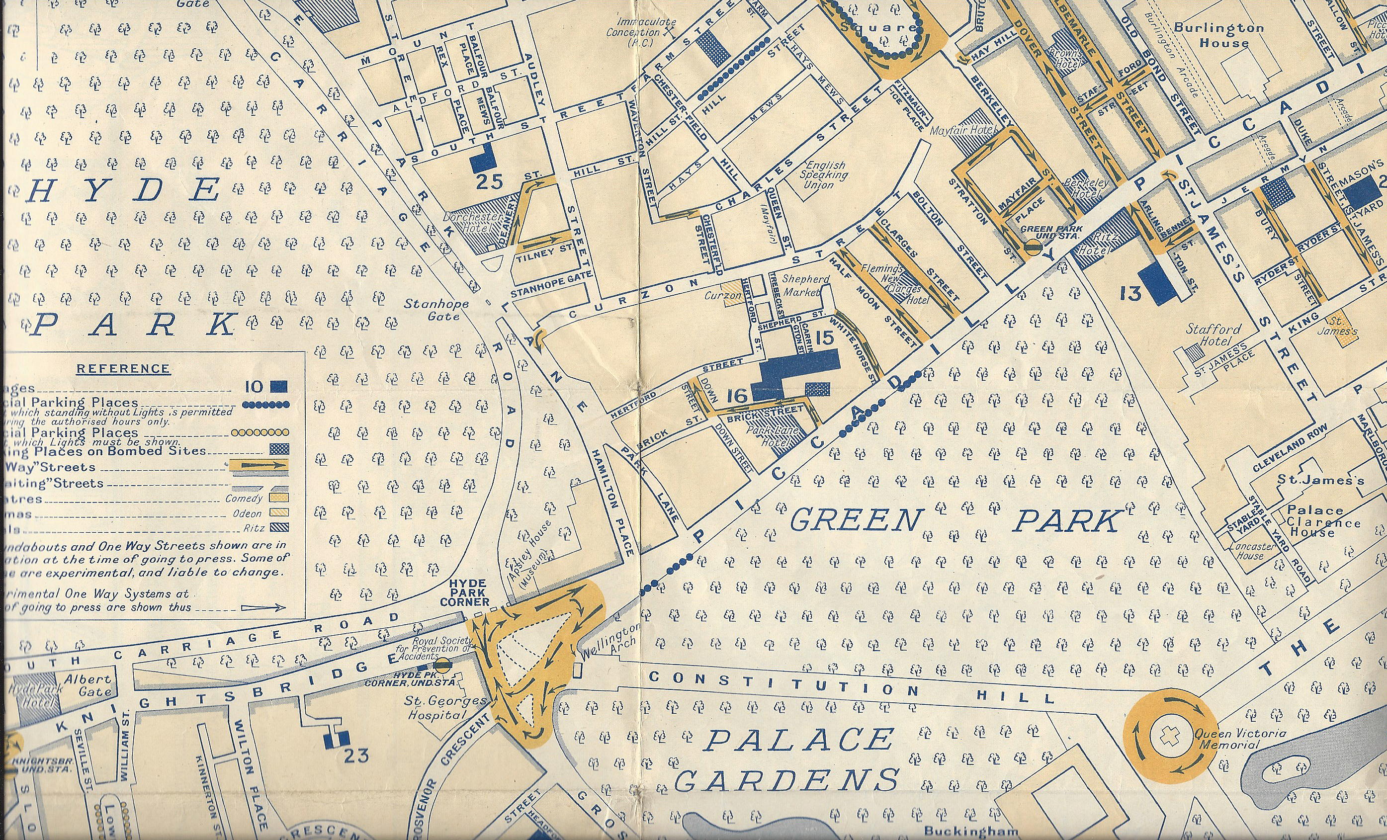 The small section of map shown below, and taken from a larger sheet, was produced by the Automobile Association (AA) in the years immediately following the Second World War and was not only intended to illustrate the best motoring routes into London and the West End, but also show garages, official parking places, parking places on bombed sites, ‘no waiting’ streets, theatres, cinemas and hotels.