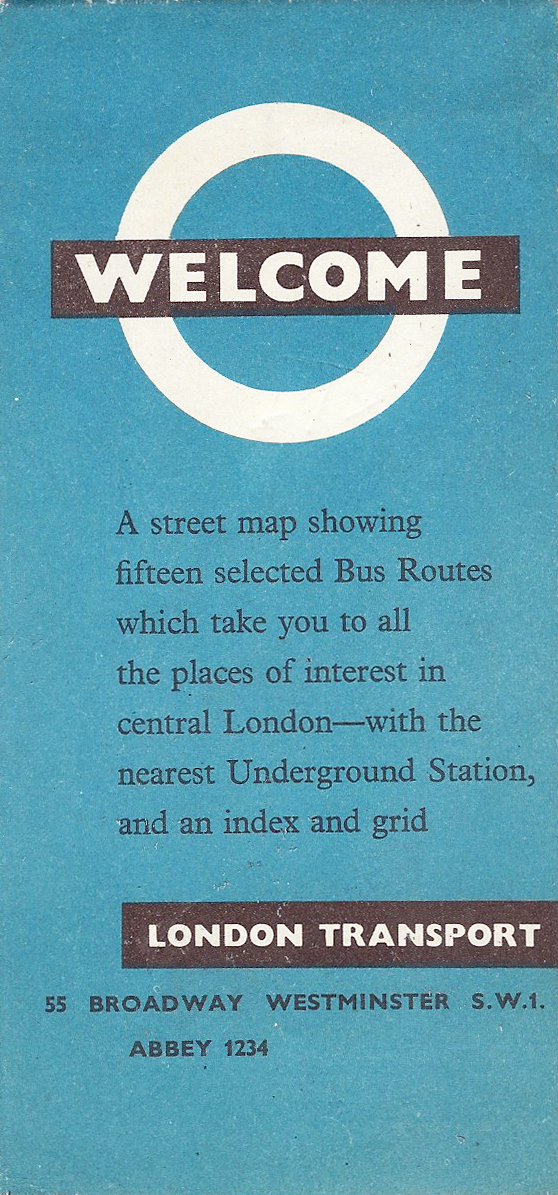 London Transport ‘Welcome’ map produced by London Transport detailing fifteen bus routes taking in ‘places of interest’. 1964