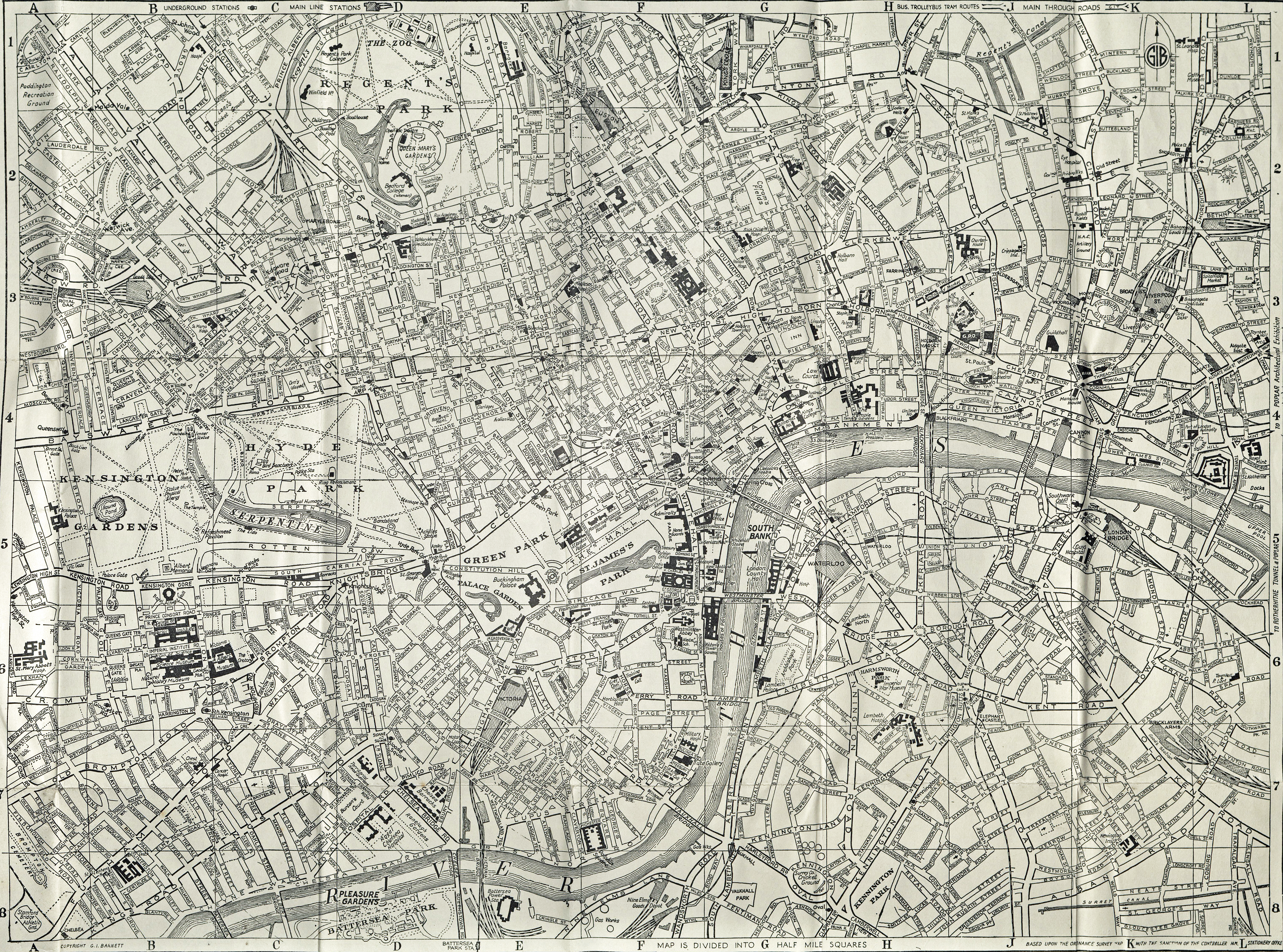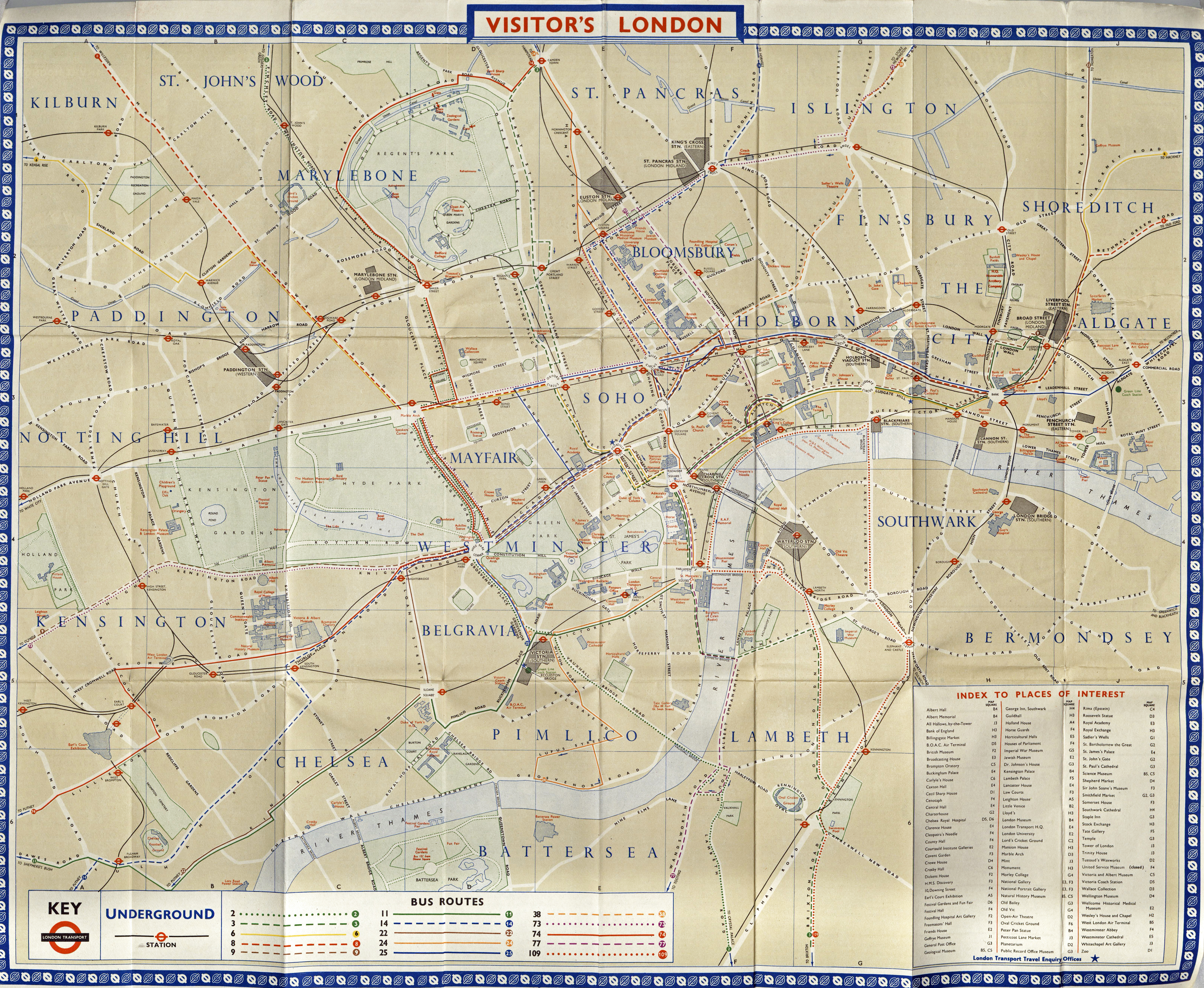 Following the Second World War there was a push to reinvigorate the tourist and general visitor presence in London. Some beautiful and detailed maps were produced but all, perhaps unsurprisingly, appear to usually have a purchase price associated with them. For someone looking to simply walk the streets of London with the minimum of outlay, the maps produced by the bus companies were probably their best option.