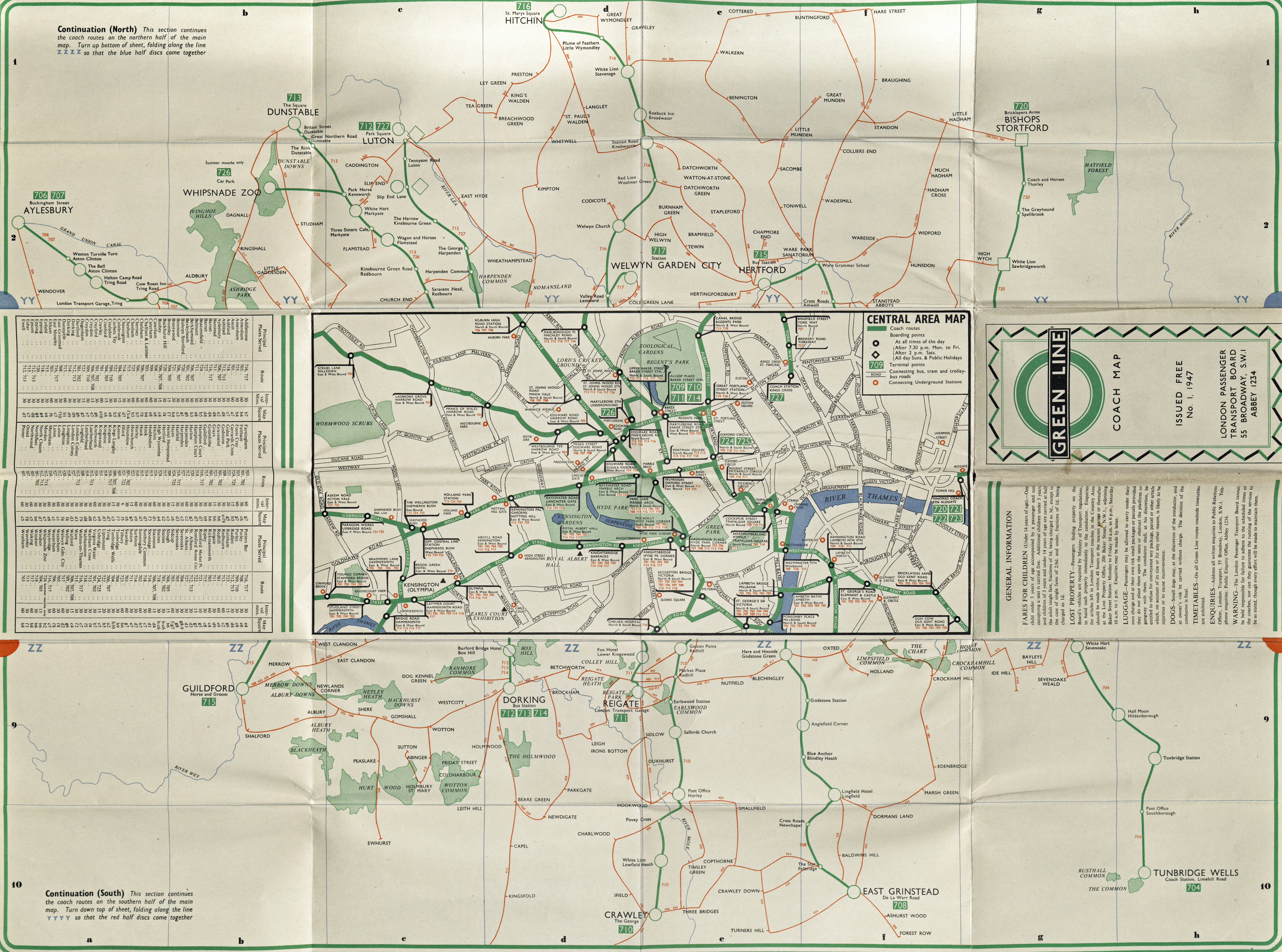The London General Omnibus Company registered the Green Line Coach service in 1930. The coaches linked central London with country towns within a 30 miles radius. It was this network that was shown on their maps.