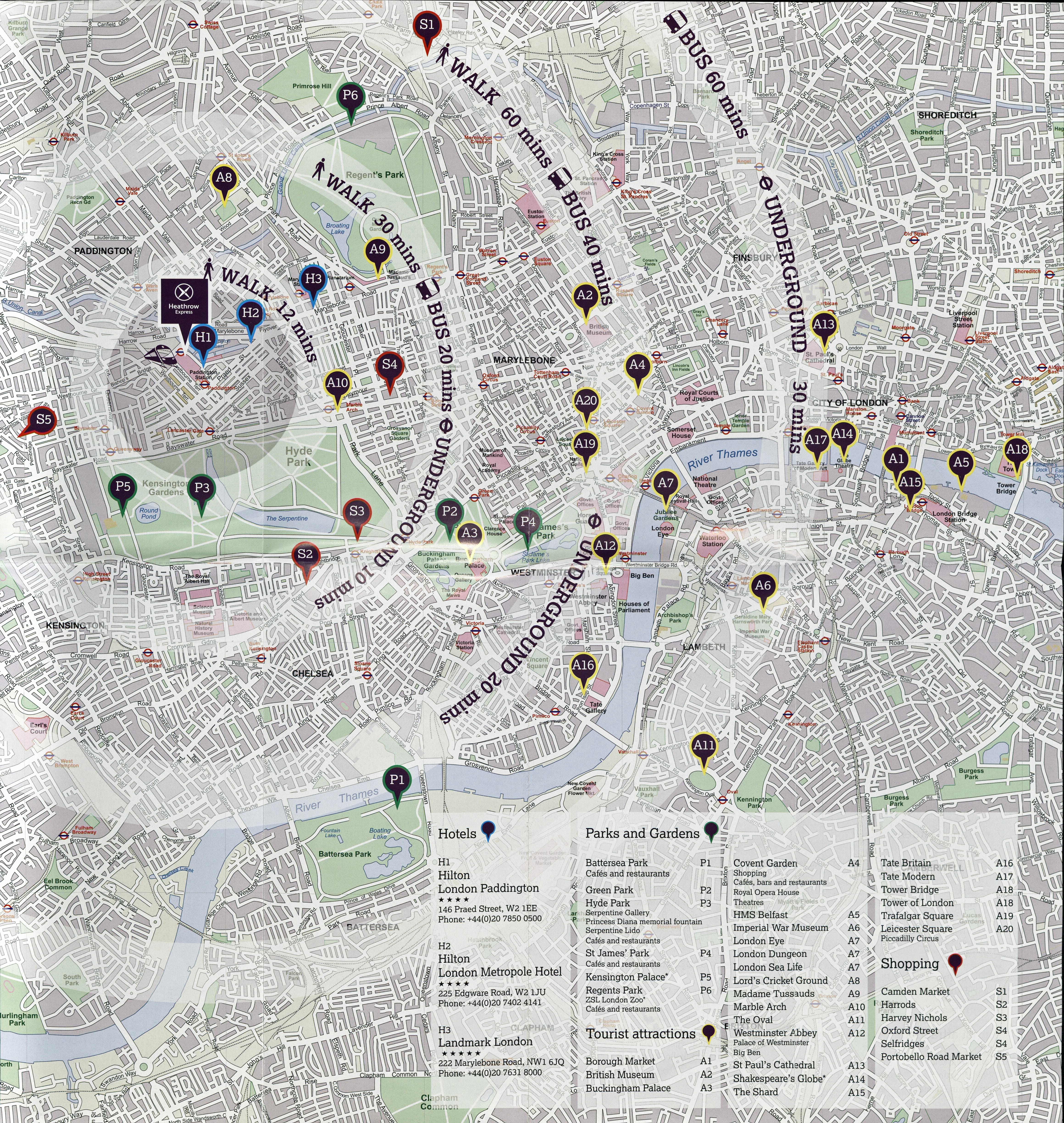 Central London map and guide produced by Heathrow Express and available to the public free of charge
