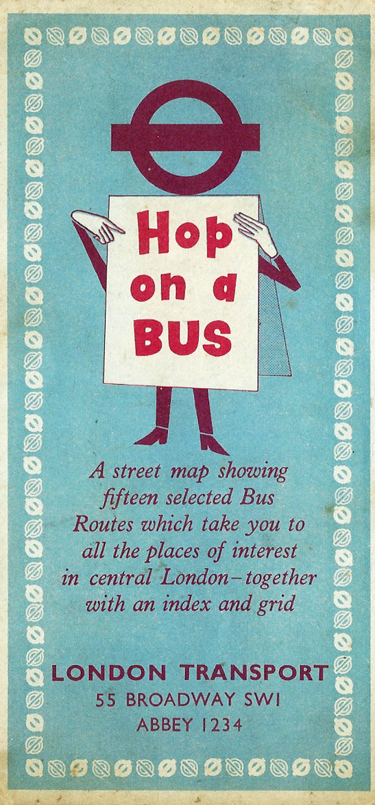 Small pocket map with Hop on a Bus character that first appeared on posters in 1958. Published by London Transport in 1959