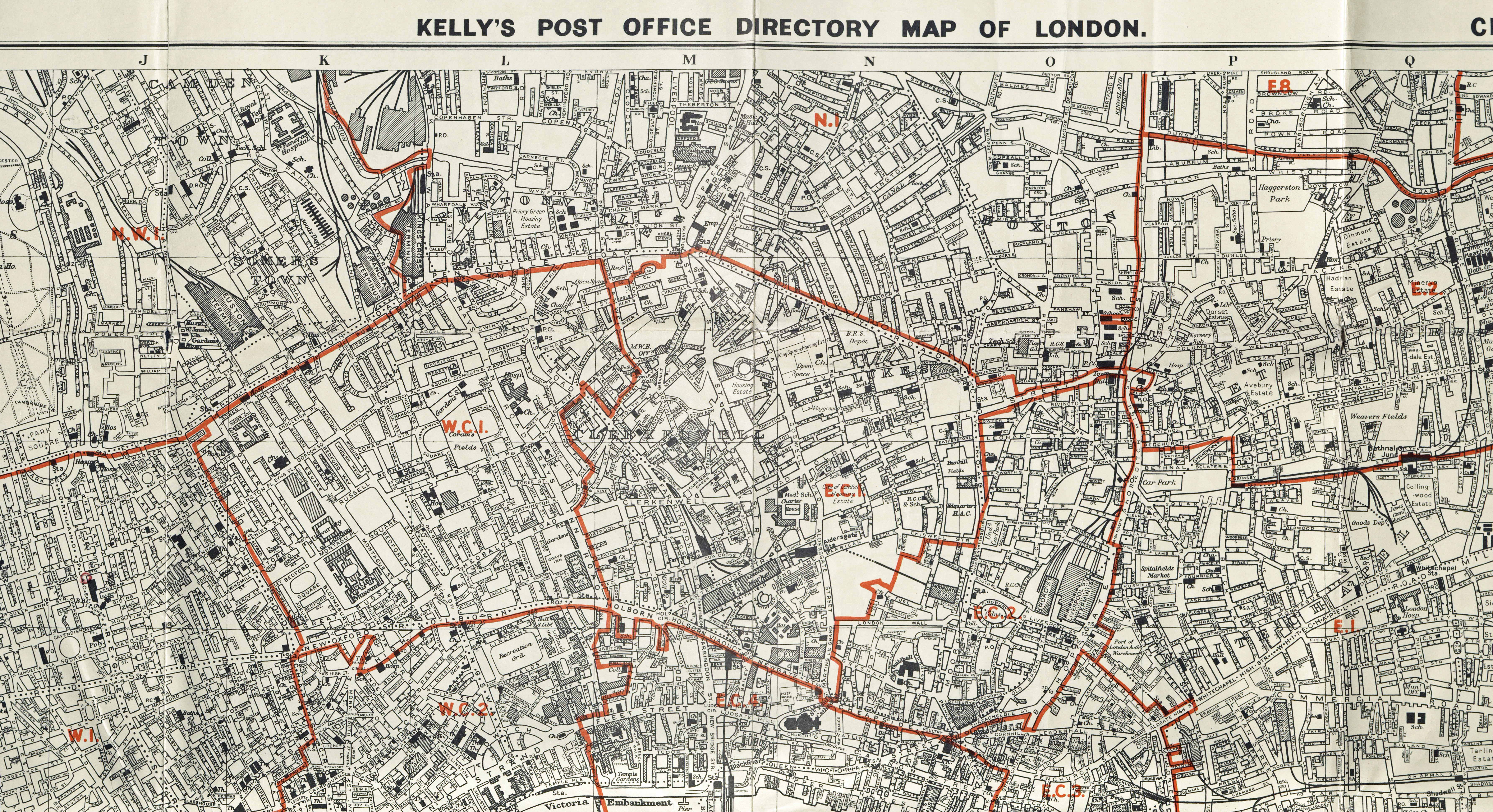 Section from a London districts map prepared by Kelly’s in 1968. The Post Office produced accurate directories and maps from 1800. One of their officials, Frederic Kelly, began producing his Post Office Directory of London from 1836, albeit without official sanction. The Kelly maps were especially detailed and accurate and could be viewed by the public in larger post offices and libraries as well as being available for purchase