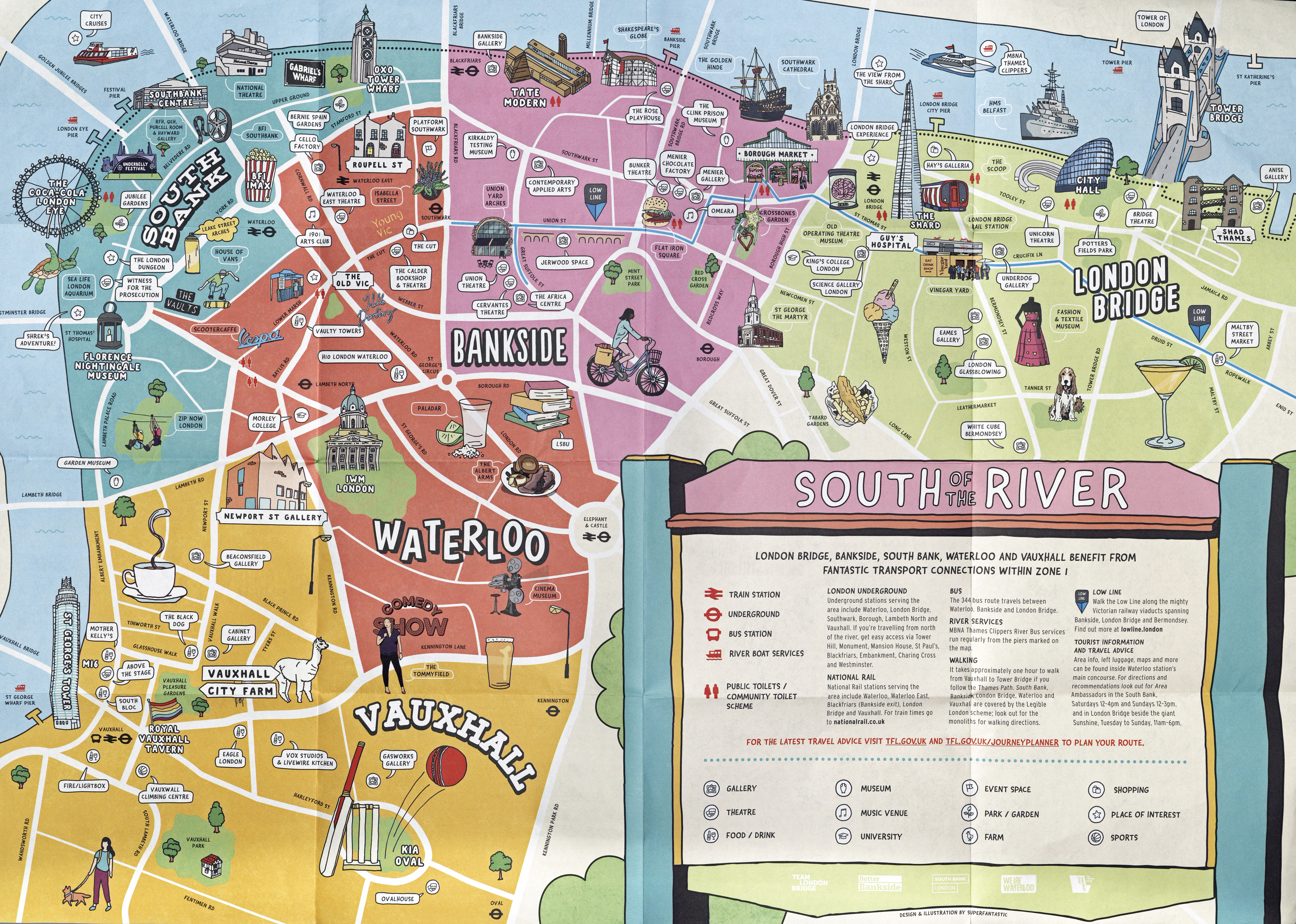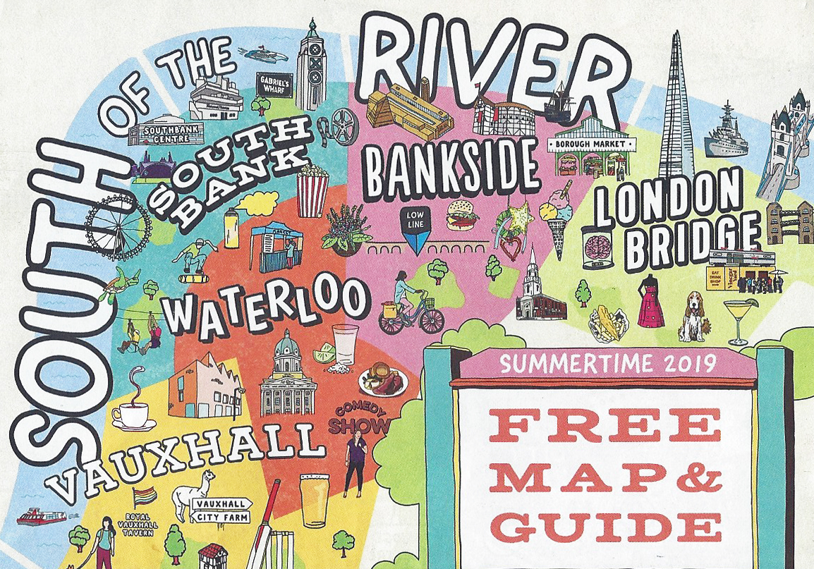 Recognising this difficulty in attracting the tourist, some local councils in traditionally less visited parts of the Capital have backed production of free maps showing ‘their’ neck of the woods. Some designs of map have pushed at traditional design, again with the inherent problem of ending up with a product that looks pretty but is difficult to actually navigate with on the ground. Competing for the prize of worst map for walkers shown here, the South of the River map is a strong contender.