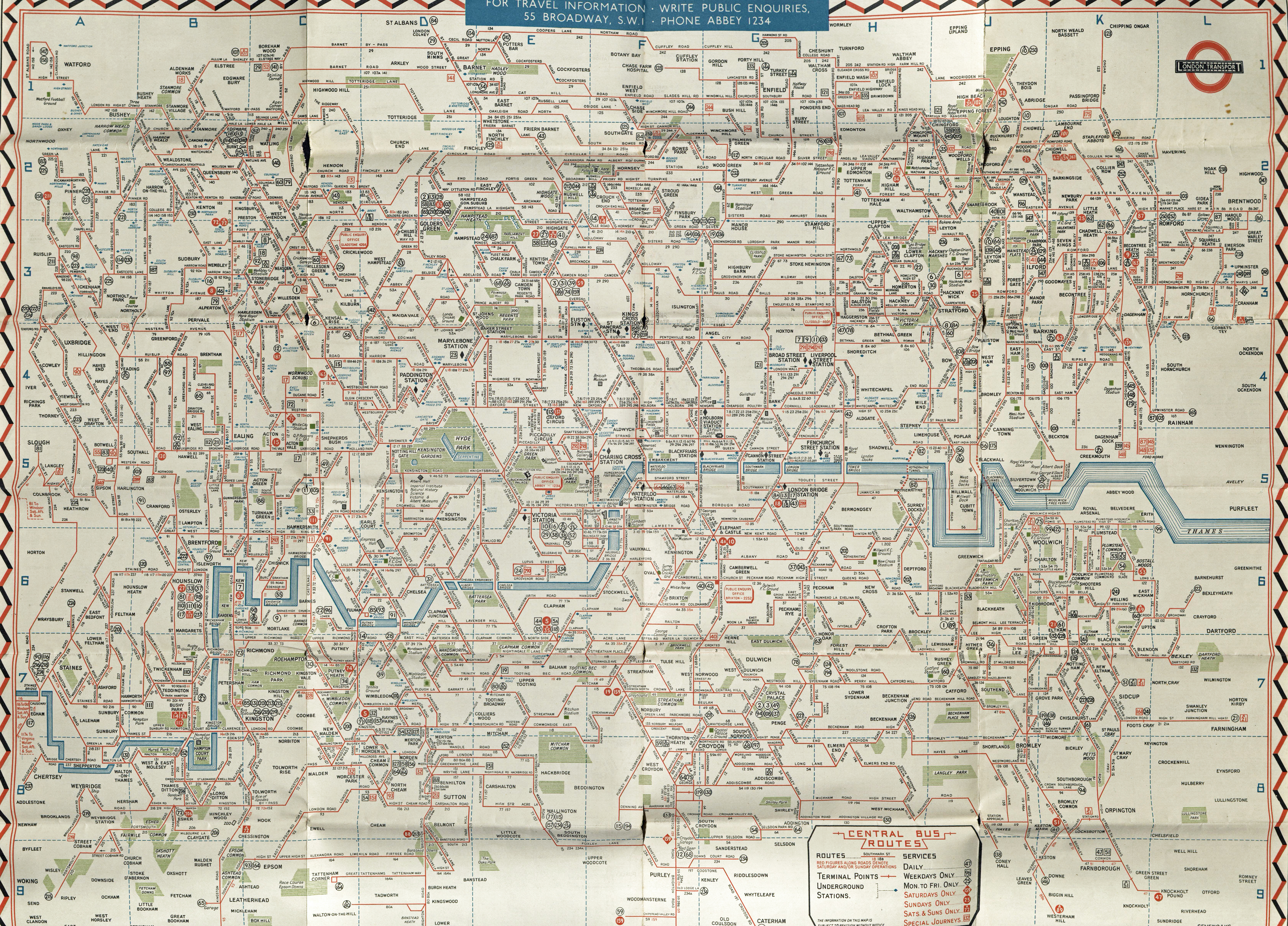 Bus map drawn by J.H. Elston and printed by Waterlow & Sons. More like a wiring diagram than a street map, it would take the most determined of map reading bus goers to navigate London successfully with it. 1946