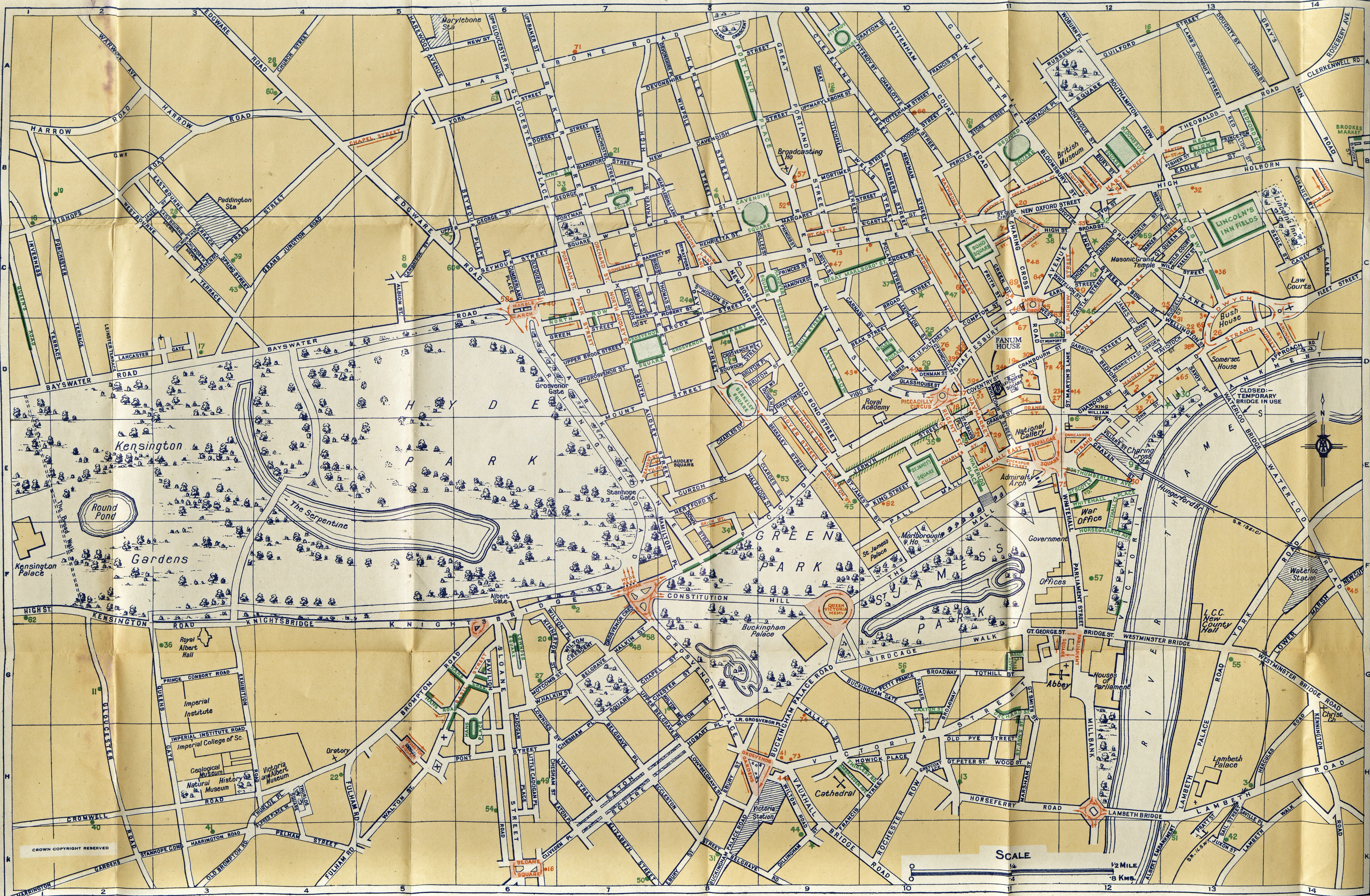 The map shown here was produced in 1954 and supplied to its customers exploring London. Though small (342mm x 221mm) the three colour map shows central London and its tourist highlights, together with addresses of the Thomas Cook London offices. Though sadly, paths across parks get short shrift.