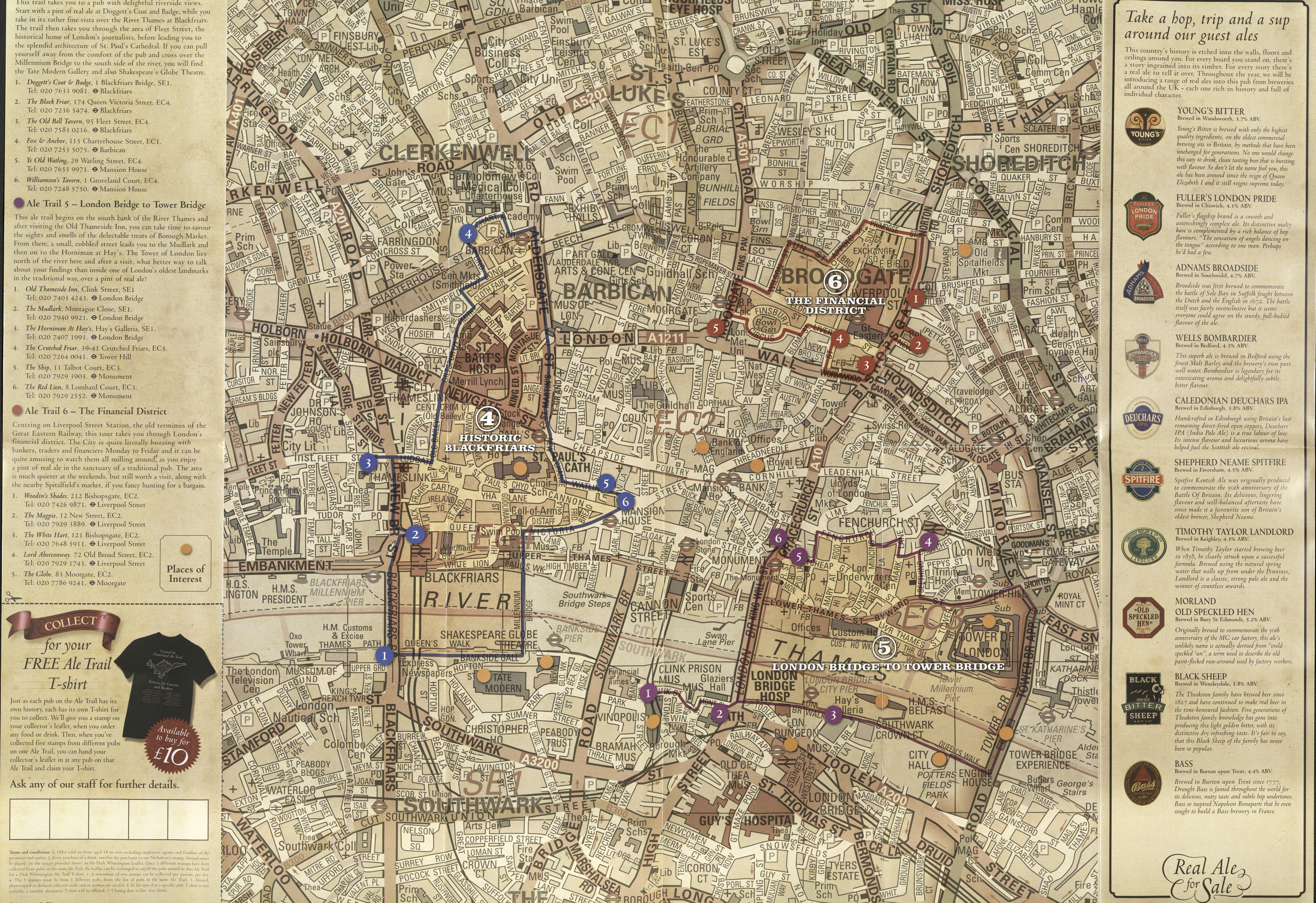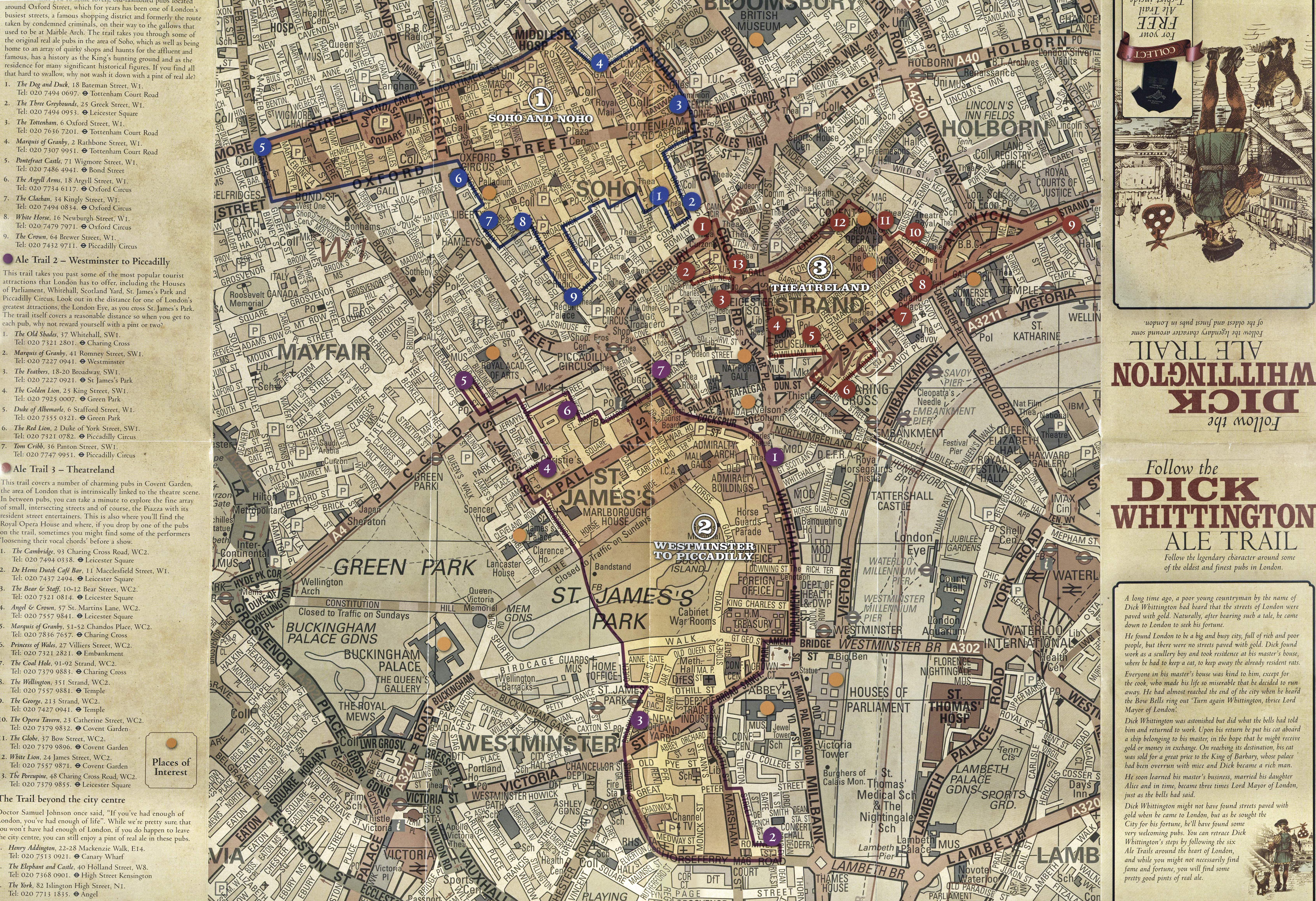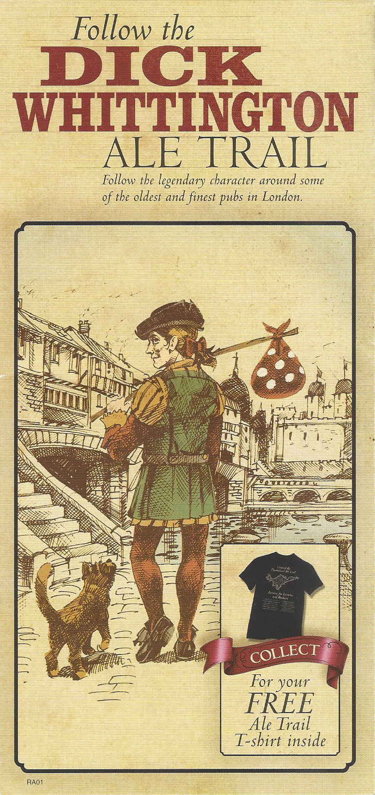The Dick Whittington Ale Trail produced in 2006 was aimed firmly at the tourist and expounded on the folklore story of his becoming Lord Mayor of London three times. The story could have been adopted by just about anyone however the excellent maps do provide six pretty goods trails taking in: Soho, Westminster to Piccadilly, Covent Garden, Blackfriars, London Bridge to Tower Bridge, and the Financial heartland.