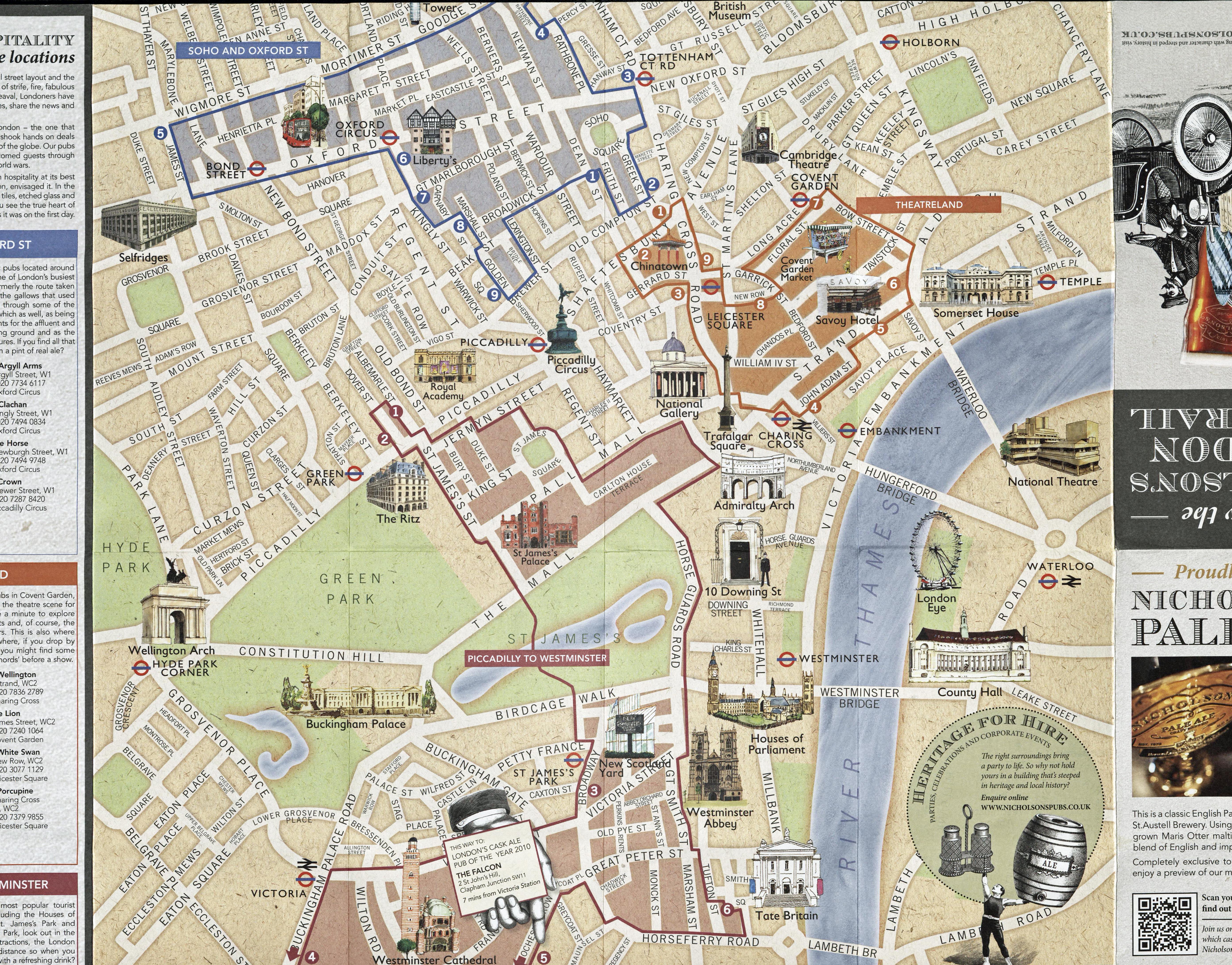 As mentioned previously, there are few reasons to give a reasonably accurate and expensive map to the general public free of charge. One straight forward commercial reason would be to encourage visitors to your establishments, be they theatres, restaurants, clubs or as shown here, public houses. But how do you get the public to visit more than one of your establishments? Perhaps in areas of London unknown to them or infrequently visited. By leaning heavily both on the unique features of your various venues and on the very history of London itself.