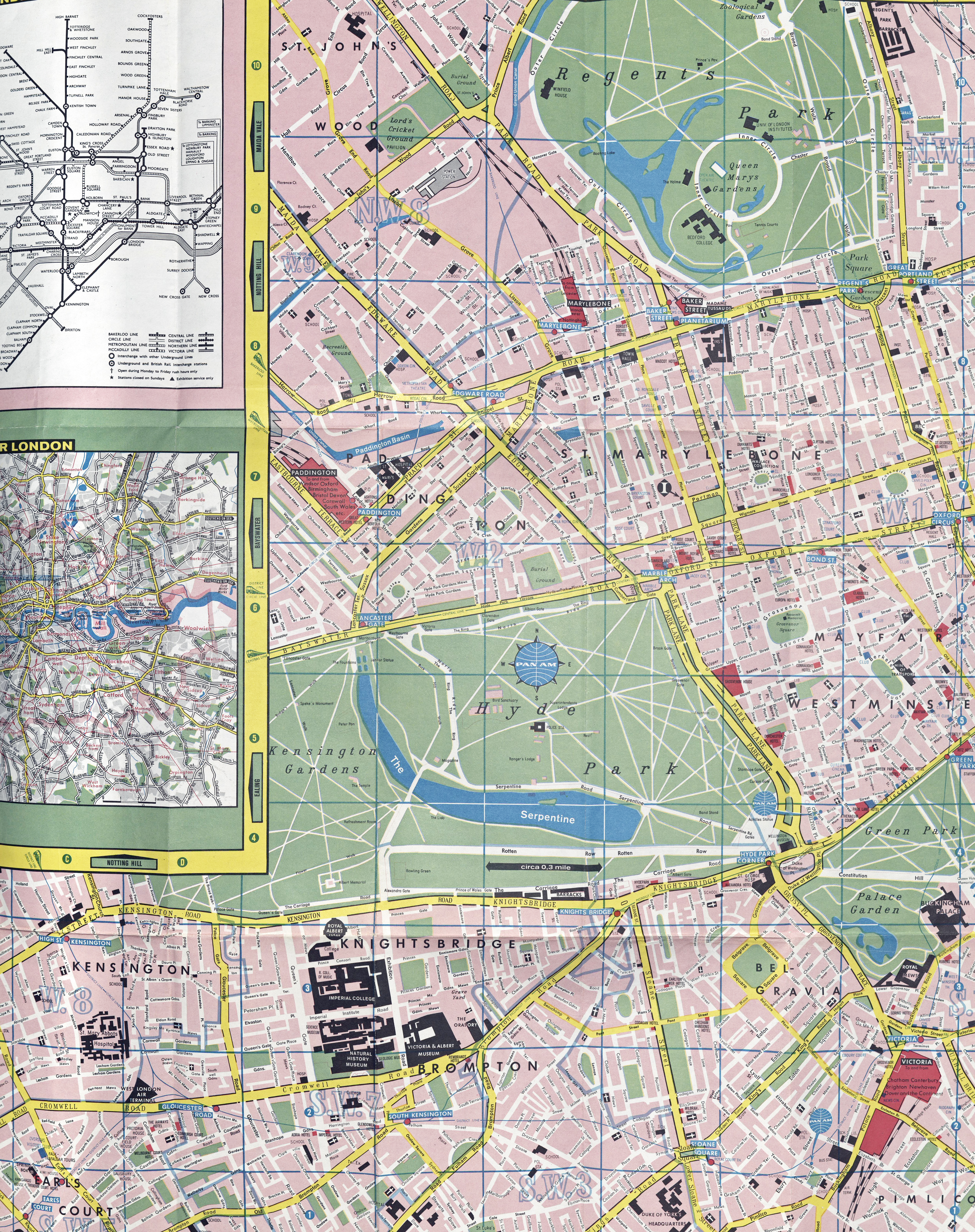 Detail- from 1971 PanAm map supplied to its passengers, shows NW, W and SW London on one side.