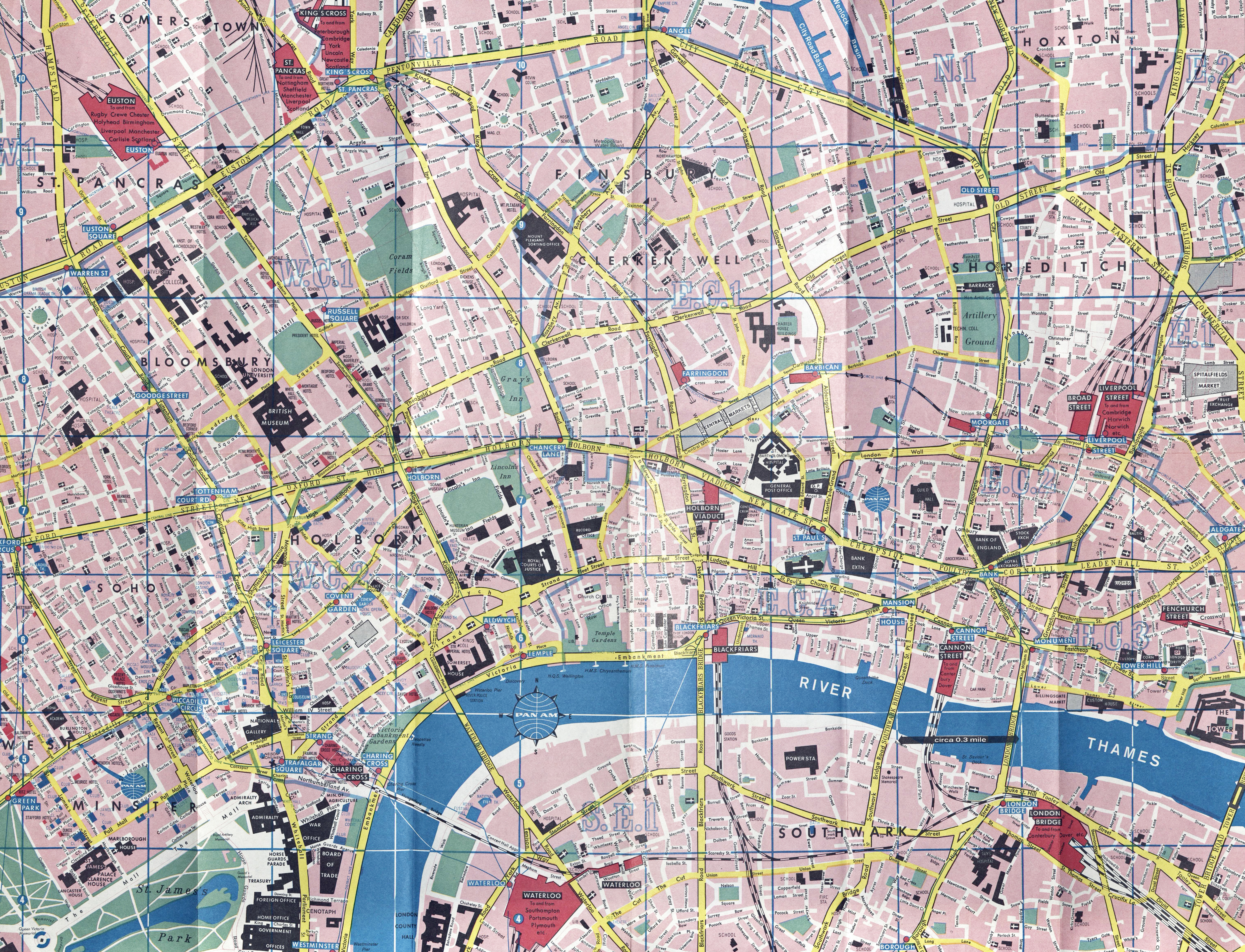 Anyone who has used an Ordnance Survey map will appreciate that they are probably the finest aid to country walking, however try and use one in a city and it is just about impossible to follow a route on their maps. An alternative would be sought. There have been a number of commercial London maps produced, there have also been quite a number of free maps that have frequently been all that is required. Three Points of the Compass takes a glance at some of the useful paper maps for London that those in the know could, and can, obtain for FREE. Clicking on any image will enlarge it.