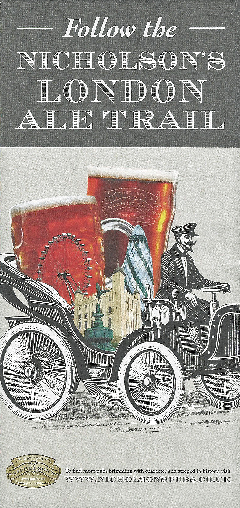 Three Points of the Compass walked one such route in November and covered the Shepherd Neame City of London Walk in a previous blog. While Shepherd Neame, who supplied the free map for that wander through London, relied most heavily on the history of their pubs, other brewers and pub owning companies have also incorporated history and mythology into their ‘pub trails’. The small Maidenhead brewer Nicholson’s was bought out in the 1950s and their brand is now used by Mitchells and Butlers for an enviable selection of historic pubs in London and other cities. A free map taking in many of the London pubs was developed and distributed free of charge to thirsty drinkers.