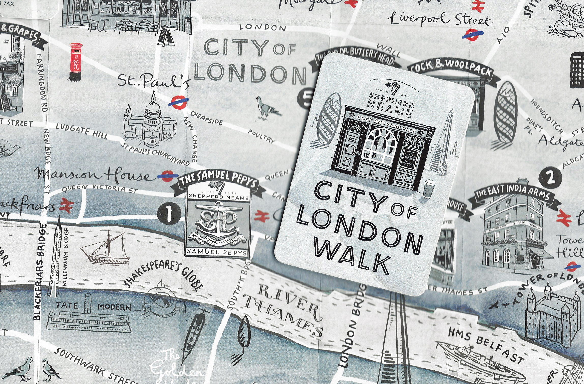 In March 2019 Kent brewers Shepherd Neame released a free map depicting a trail through London that visited eight of their pubs en route. Drawn by Peter Gander, it is an attractive product but not suited to actually following on the ground. Three Points of the Compass walked the route in November 2019