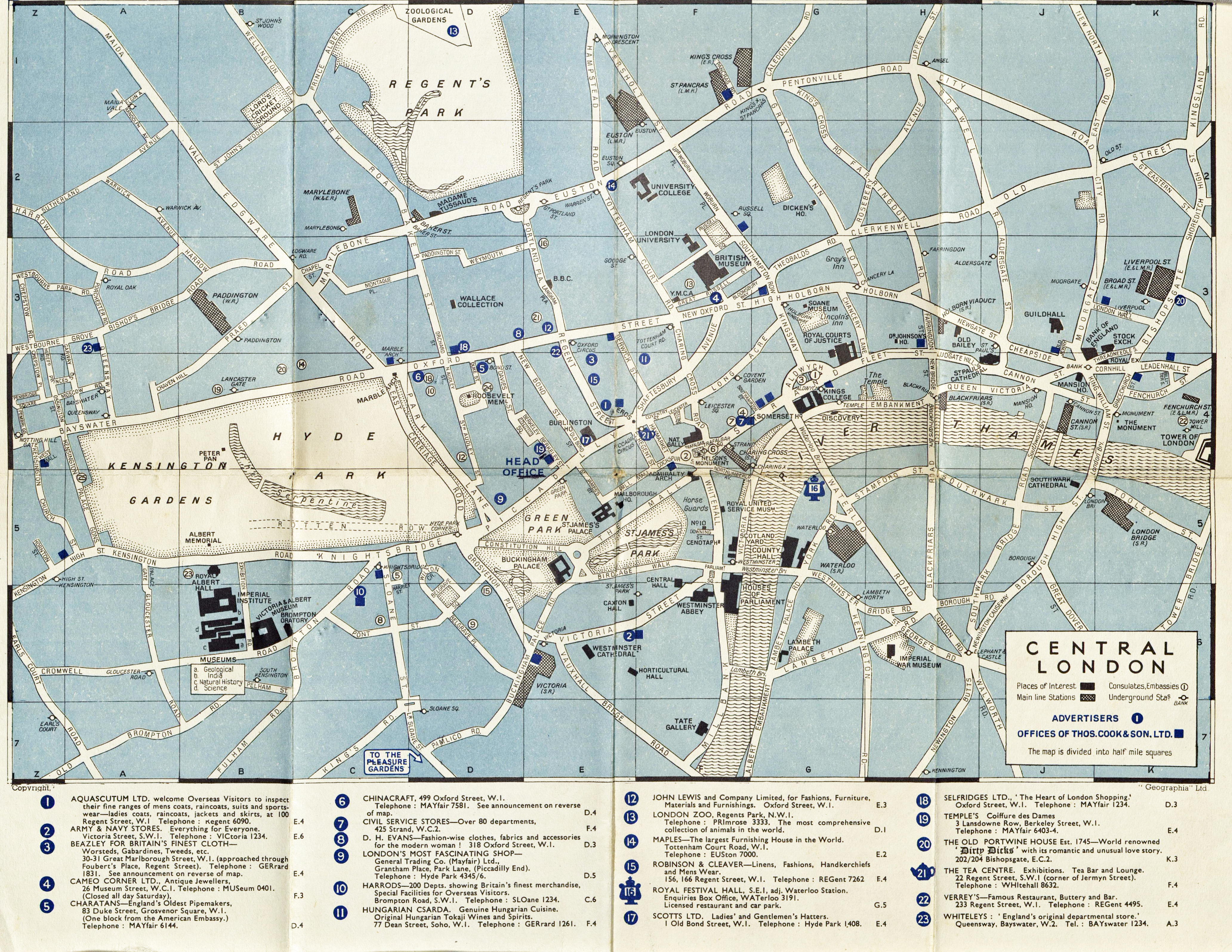 Small map of central London produced by Geographia Ltd and supplied free of charge to customers of travel agent Thomas Cook. 1954