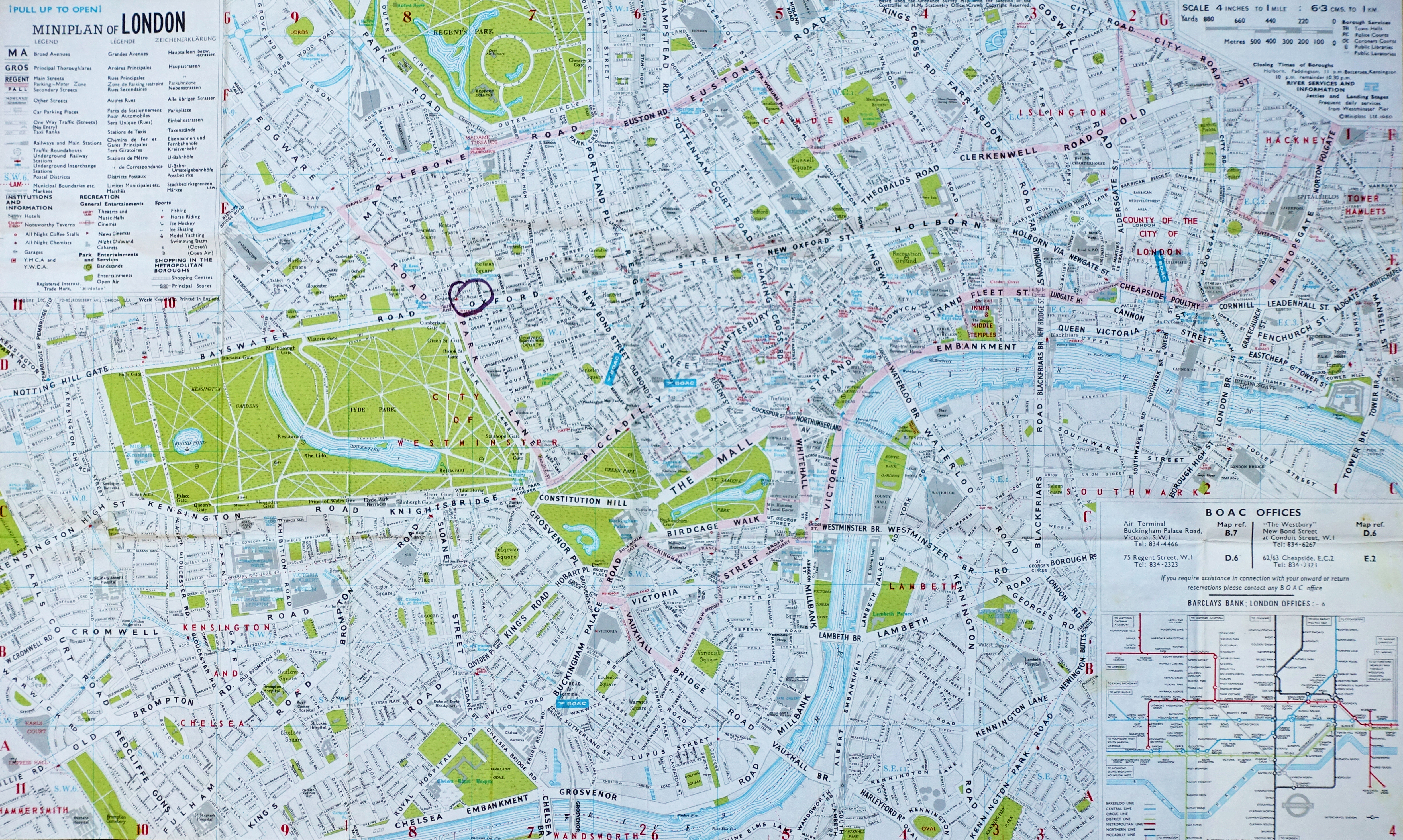 Detailed map of London given free by BOAC. Produced by Miniplans Ltd and based on O.S. mapping, 1960