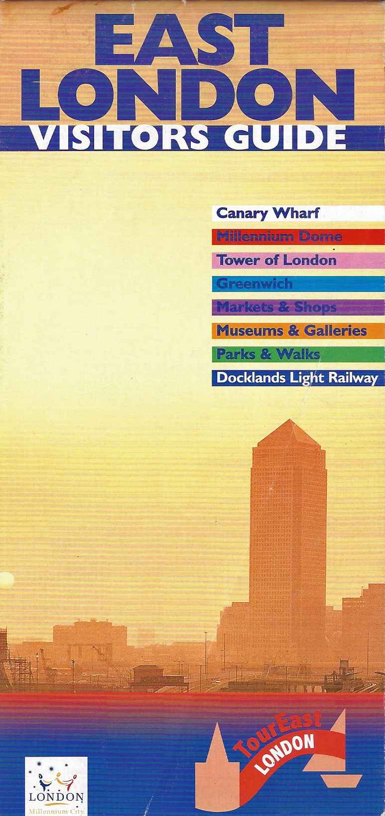 The free East of London Visitors Guide compiled in 1998 is not much better than the South of the River map produced a decade later. On the surface it appears to be quite informative, containing information on transport, including boat services, accommodation and a plethora of tourist locations. However the map is woeful. Longer cross-London paths are indicated with dotted green lines however it would be impossible to follow any of these with this map alone, or find your way through the myriad  of streets that have been left off the map. The map includes the Millennium Dome, not scheduled to open for another two years after the production of this map.