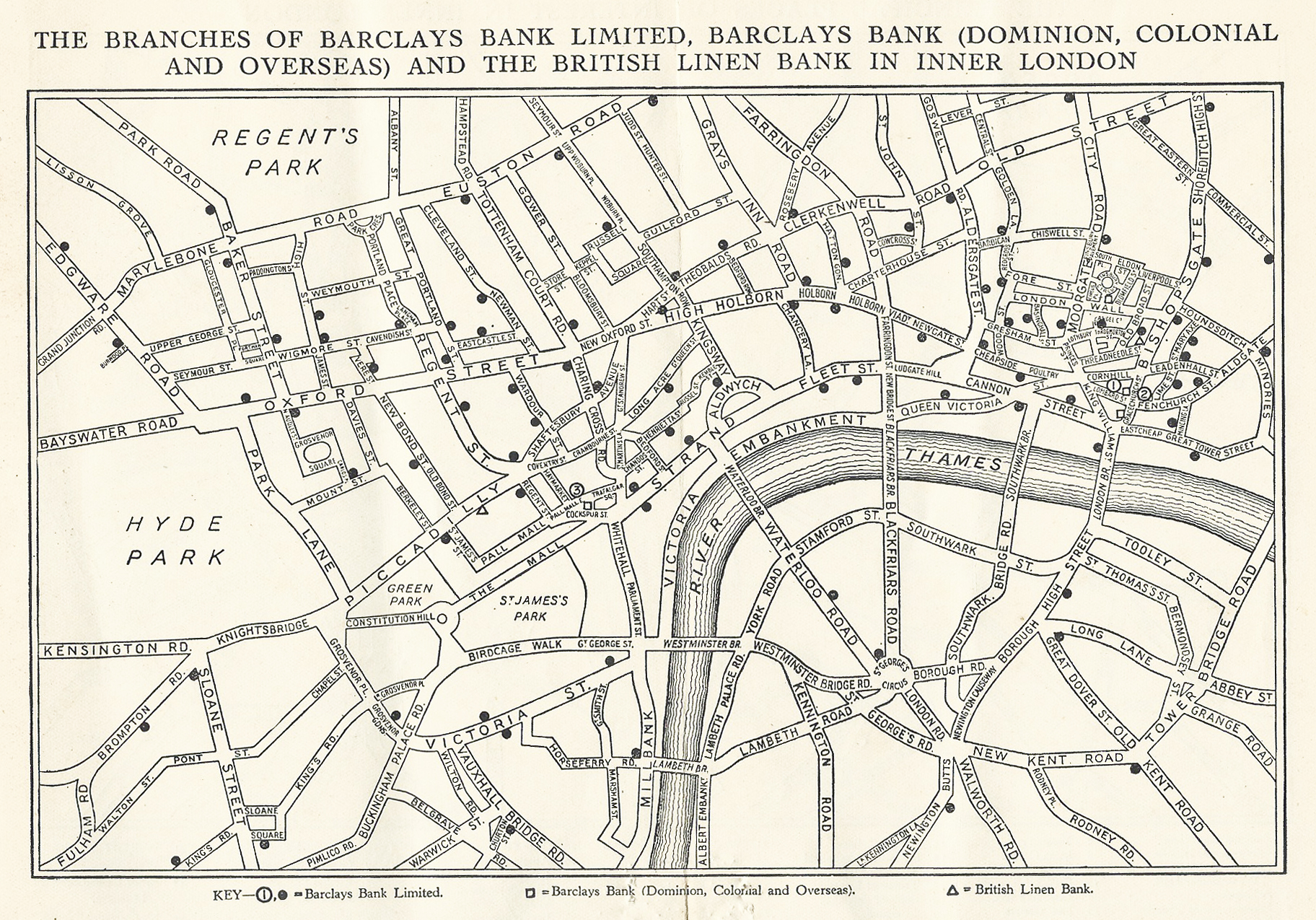 Many banks would encourage new savers and customers with free giveaways. For a period, these included useful street maps, which obviously included detail on where bank branches were situated.