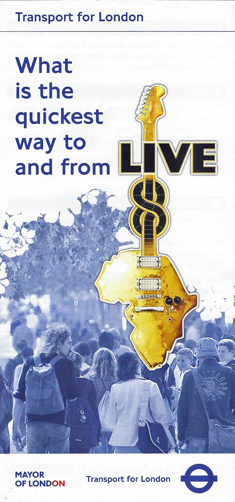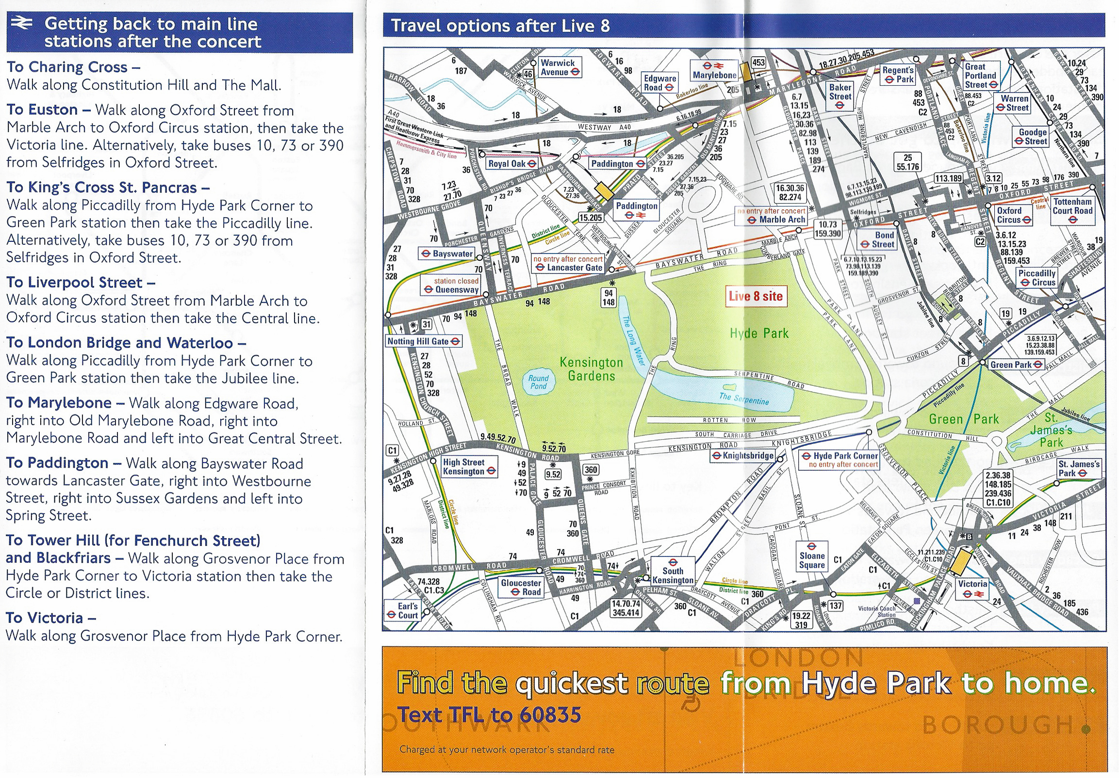 Live 8 was a free ticketed music event held in Hyde Park on 2 July 2005. TfL produced a free transport guide and map for attendees. 2005