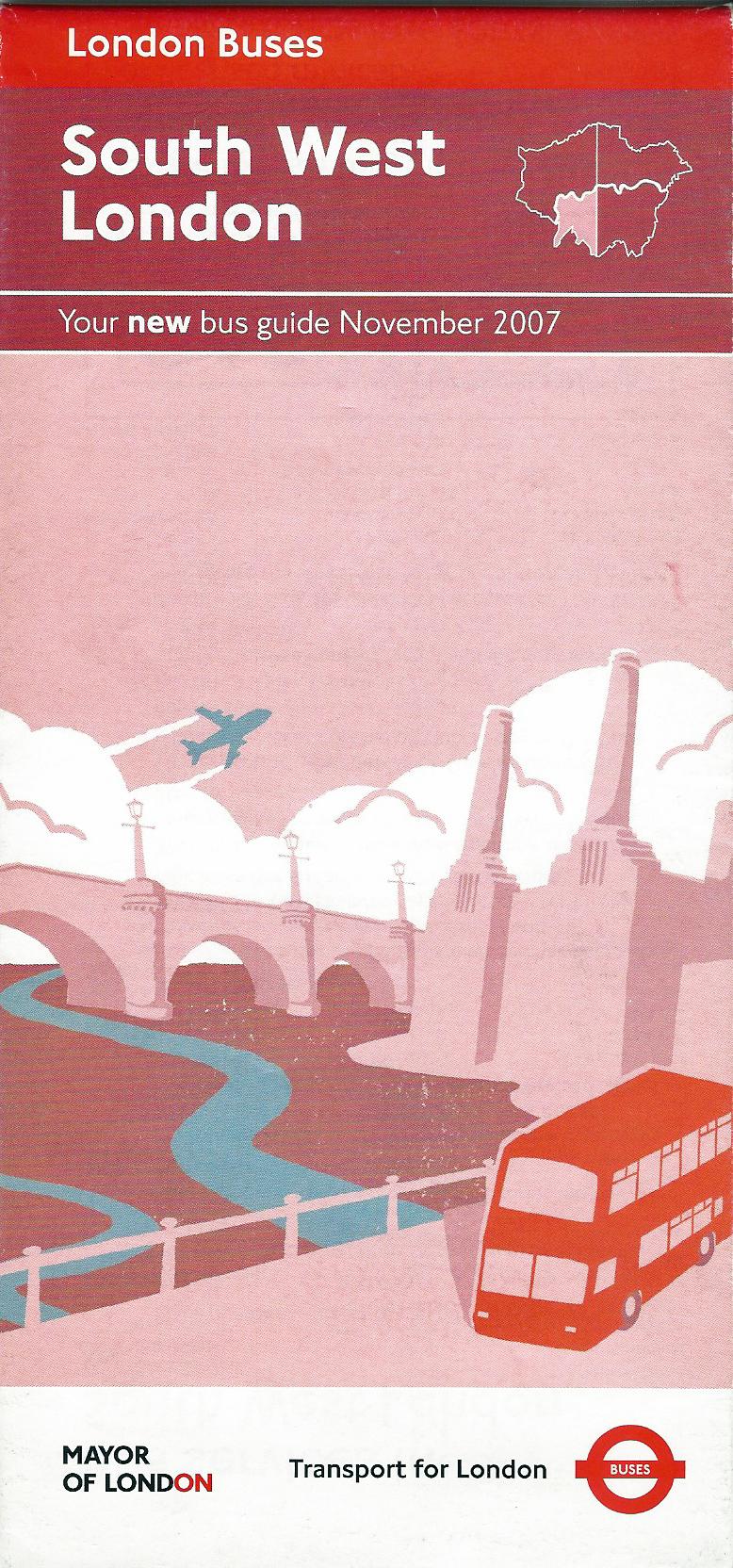 Free Transport for London bus guide to services in South West London. There are thirteen maps spread across the two sides of this map- eleven small, local area maps, a small scale map of south-west London and a large scale map of central London, a small part of which is shown here. Map drawn October 2007. Printed November 2007