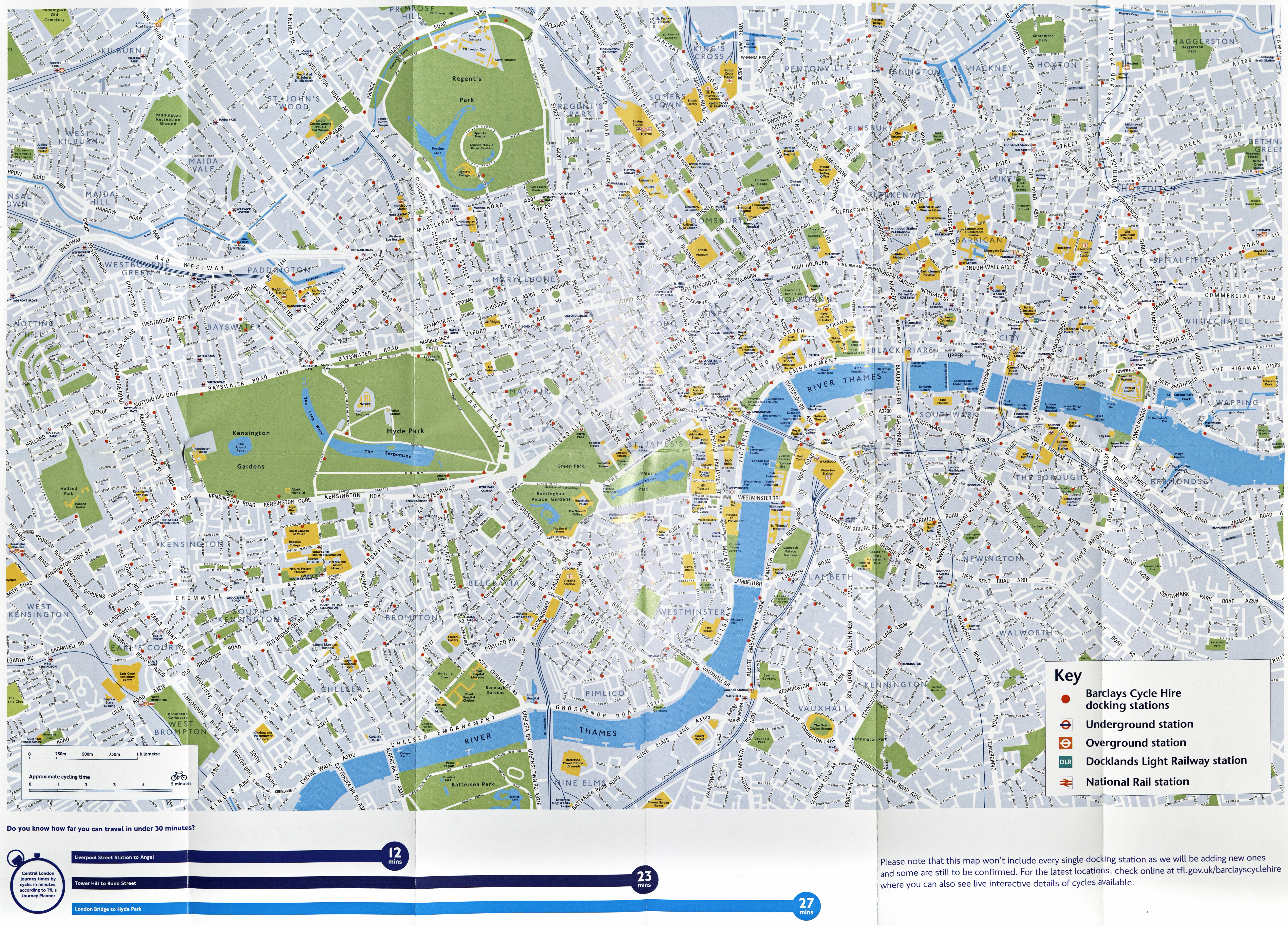 Centre section from free TfL leaflet on the Santander Cycle Hire scheme. This leaflet includes a street map that is over twice as large as the Barclays Cycle map. Some street names are now omitted on this version however paths across parks are included. 2015