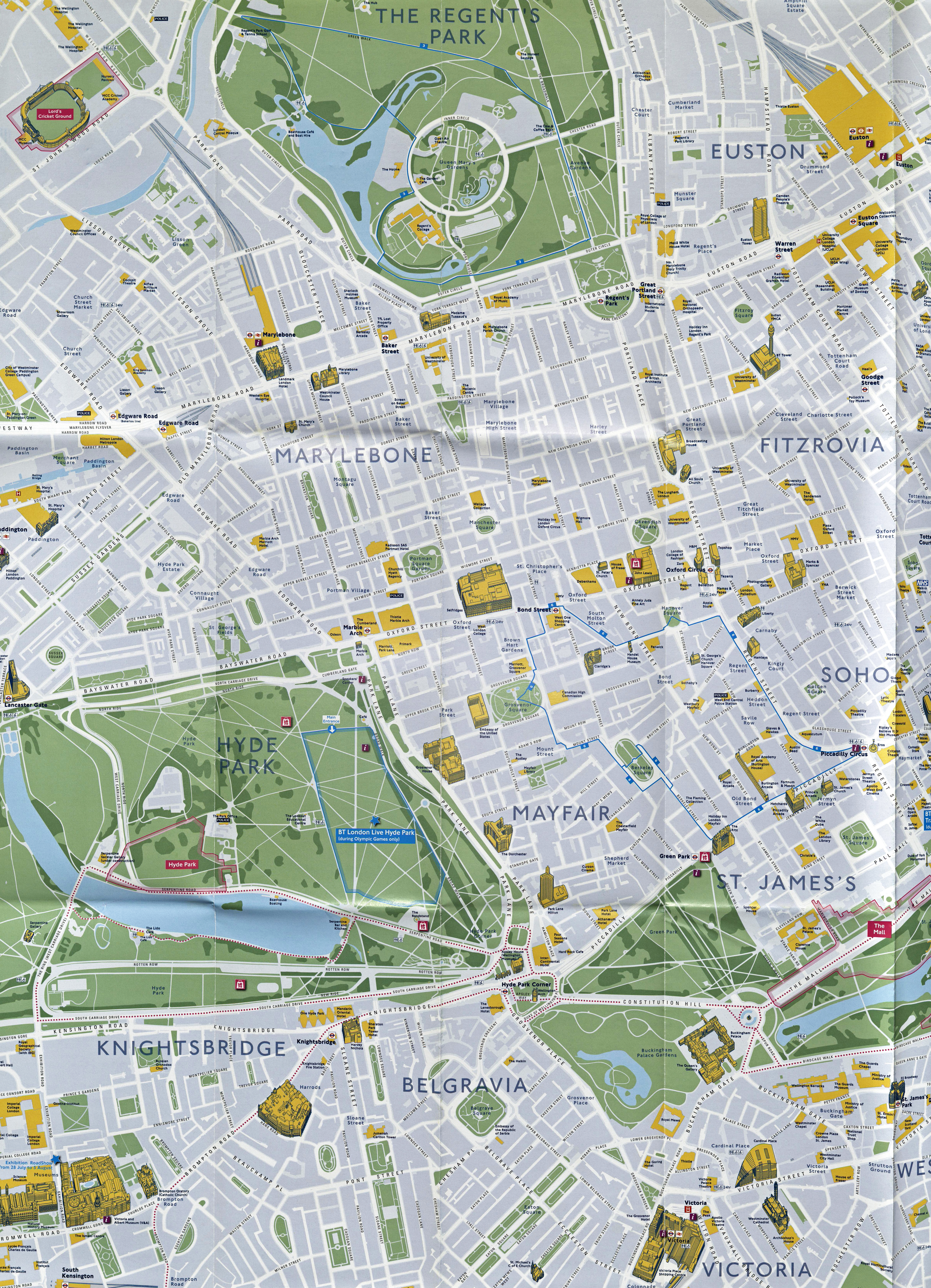 Detail from large free Summer 2012 map produced by TfL. While many places go un-named, for example those in Hyde Park, paths across green spaces are included. Based on Ordnance Survey mapping. April 2012