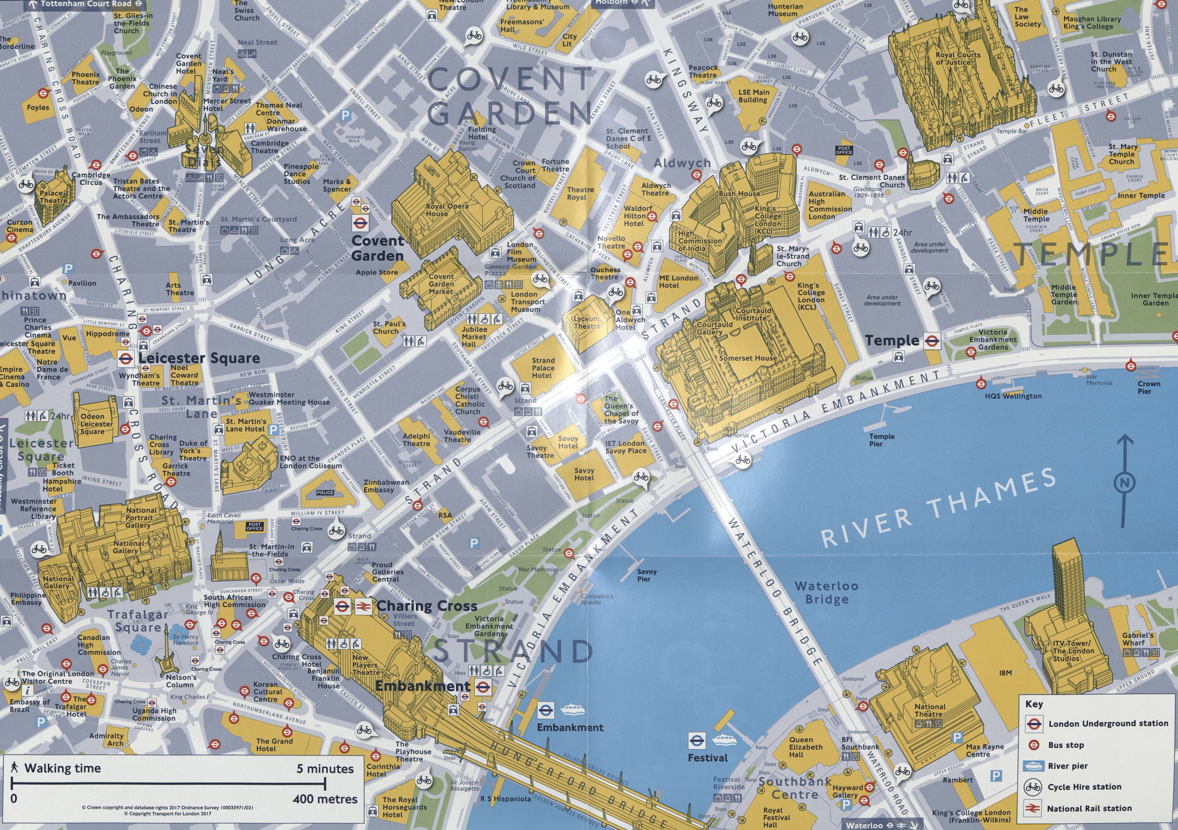 TfL’s 2017 guide to exploring by foot the North Bank area, taking in Charing Cross, Leicester Square and Covent Garden includes additional information on mainline rail and Tube links alongside cycle docking stations.