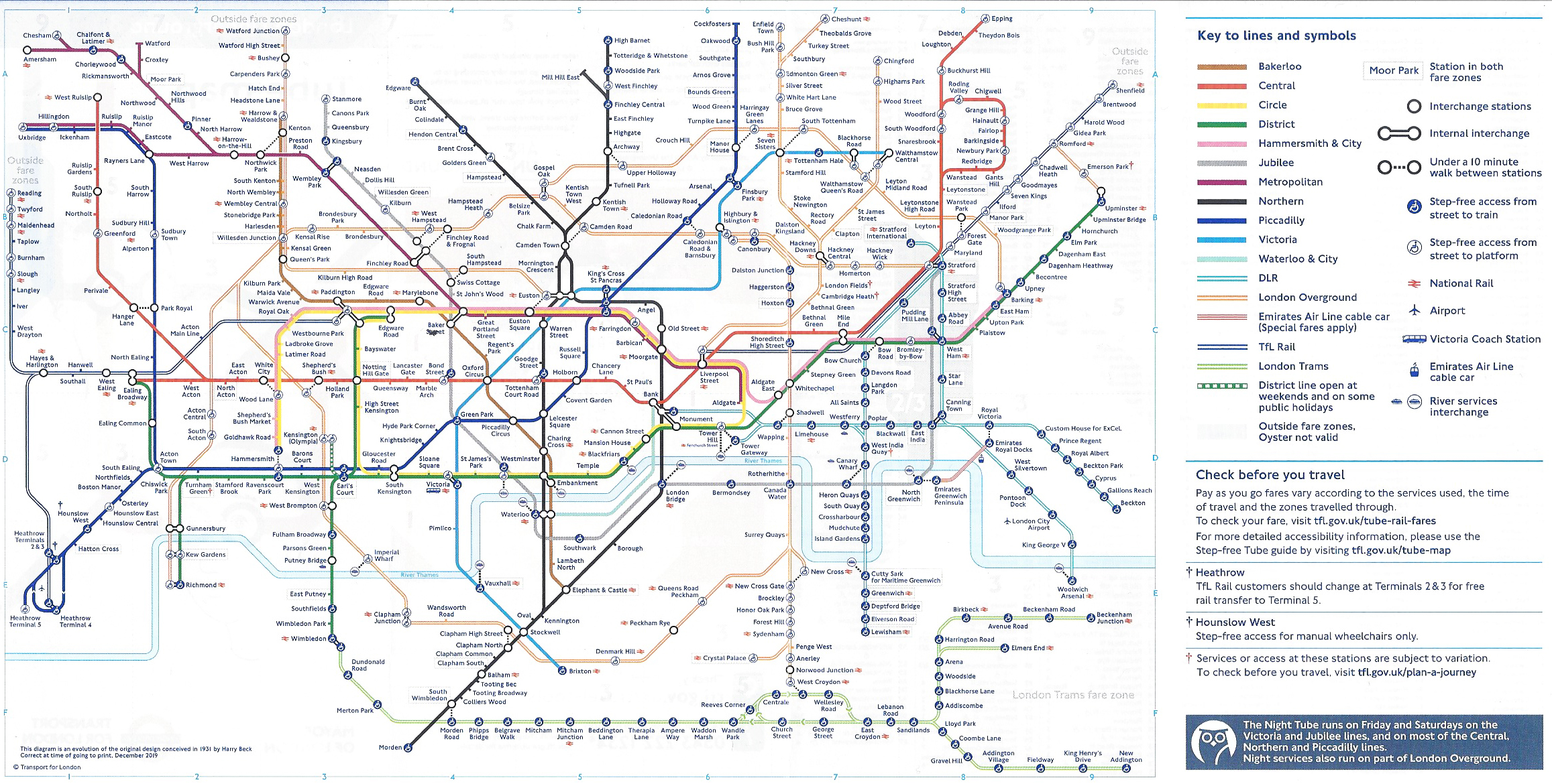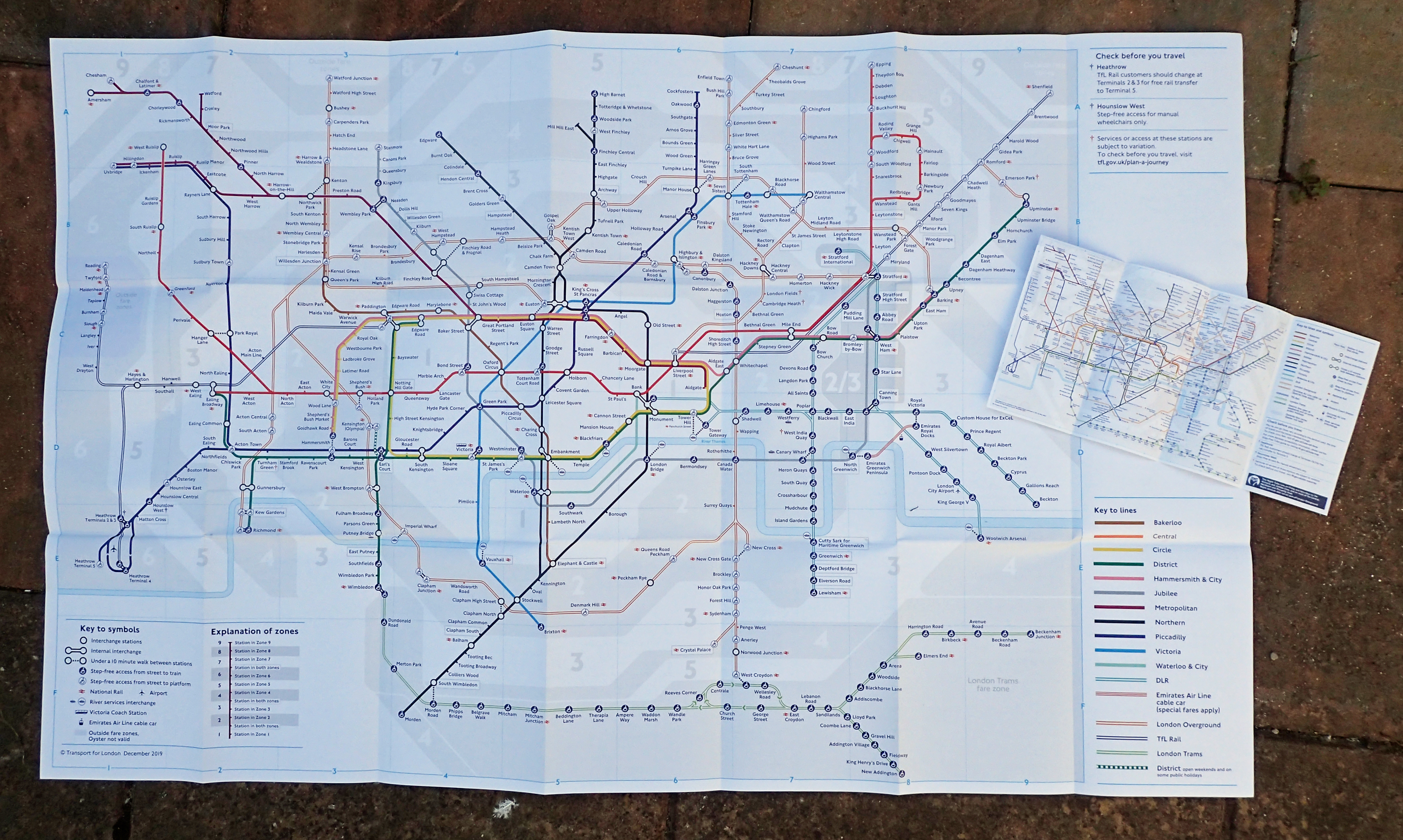 Colour large print Tube map with standard pocket size version. Each includes ‘under a 10 minute walk’ detail. Both December 2019