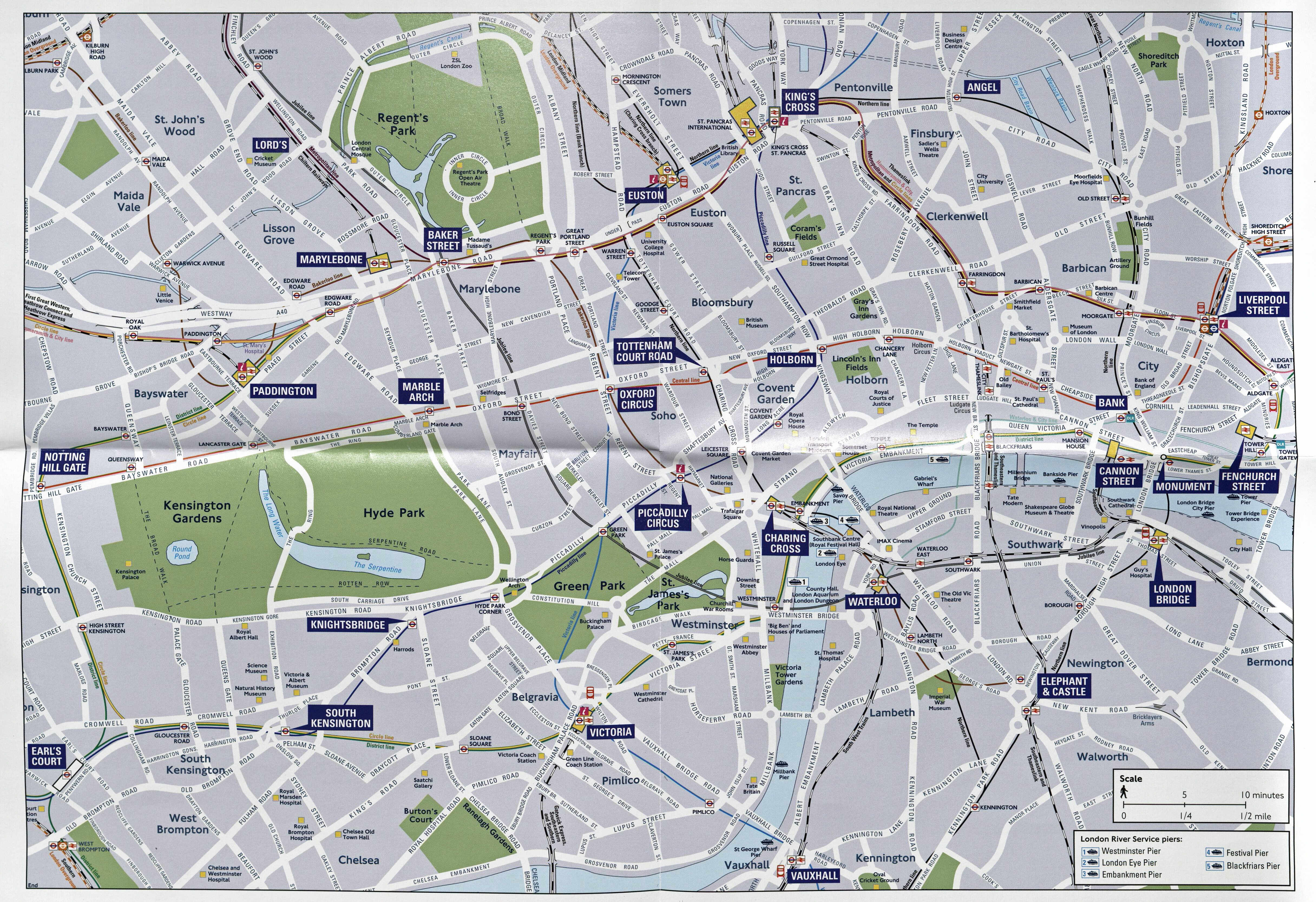 While limited in range and excluding considerable street detail, that the TfL map makers obviously felt irrelevant, the free map does show the most direct and easiest routes to walk between locations. A basic guide on how long it will take to walk between points on the map is included.