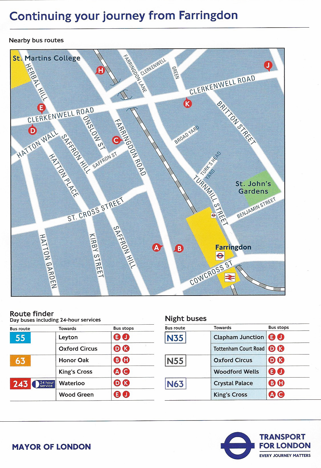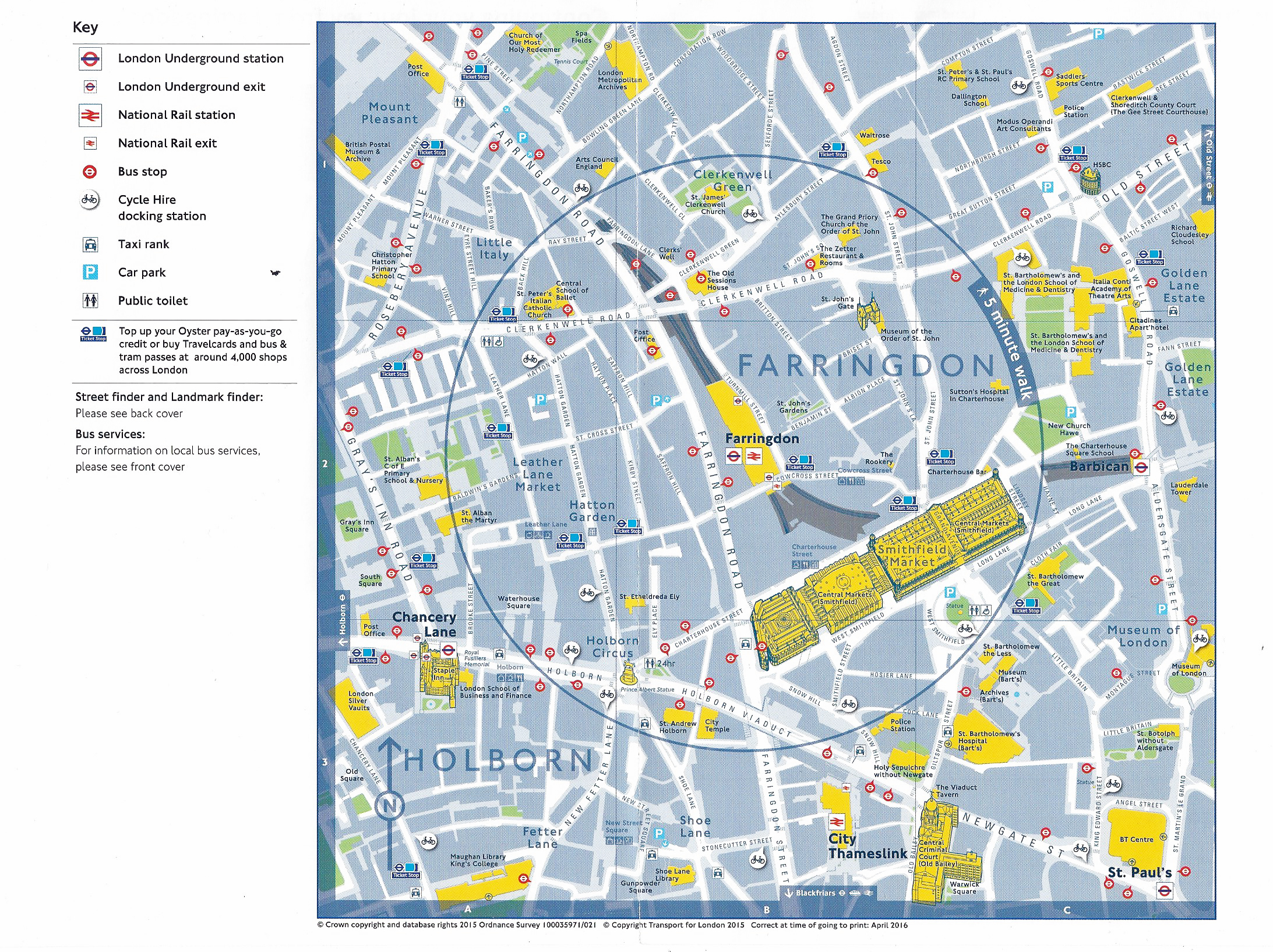 ‘Continuing your Journey’- Front cover of free paper map showing the streets and transport links around the Farringdon station. 2016
