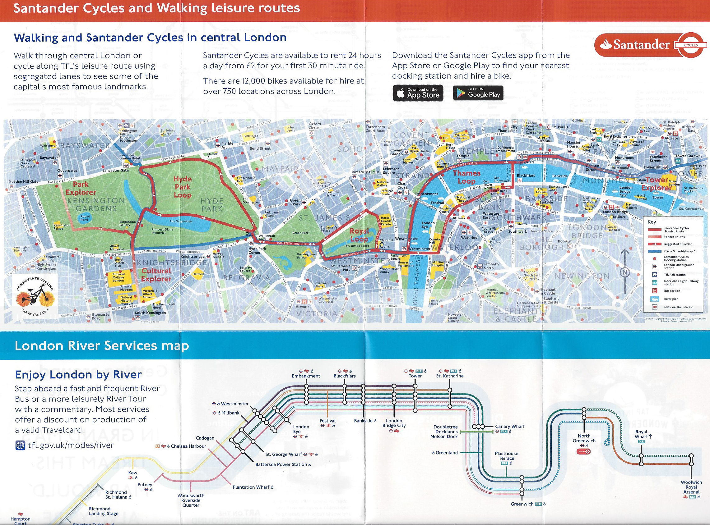 The closest TfL have come was with a variant of a standard Tube map. Expanding on the handy folding, pocket sized ‘Tube Map’, another version of the standard leaflet advises on ‘Getting around Central London’ and as well as a map of the underground lines, includes both a basic map of River Services and a simple walking map with detail on the Santander Cycles, tourist route and feeder routes in central London.