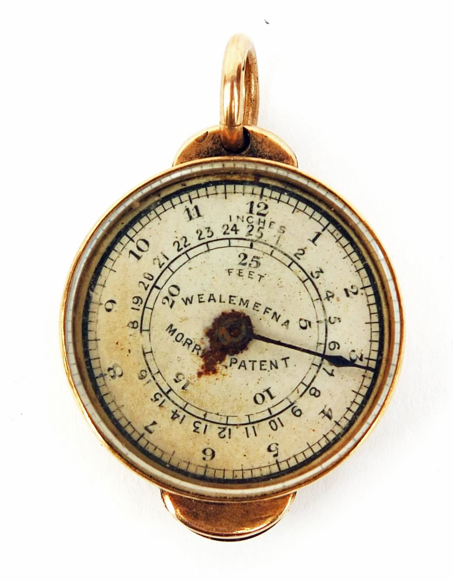 Morris’s Patent Wealemefna is a simple map measurer dating from the 1870s. It was invented by Edward Russell Morris, of the Morris Patents Engineering Works, High Street, Birmingham. Quite tiny in size and designed to hang from the end of a gentlemen’s watch chain.