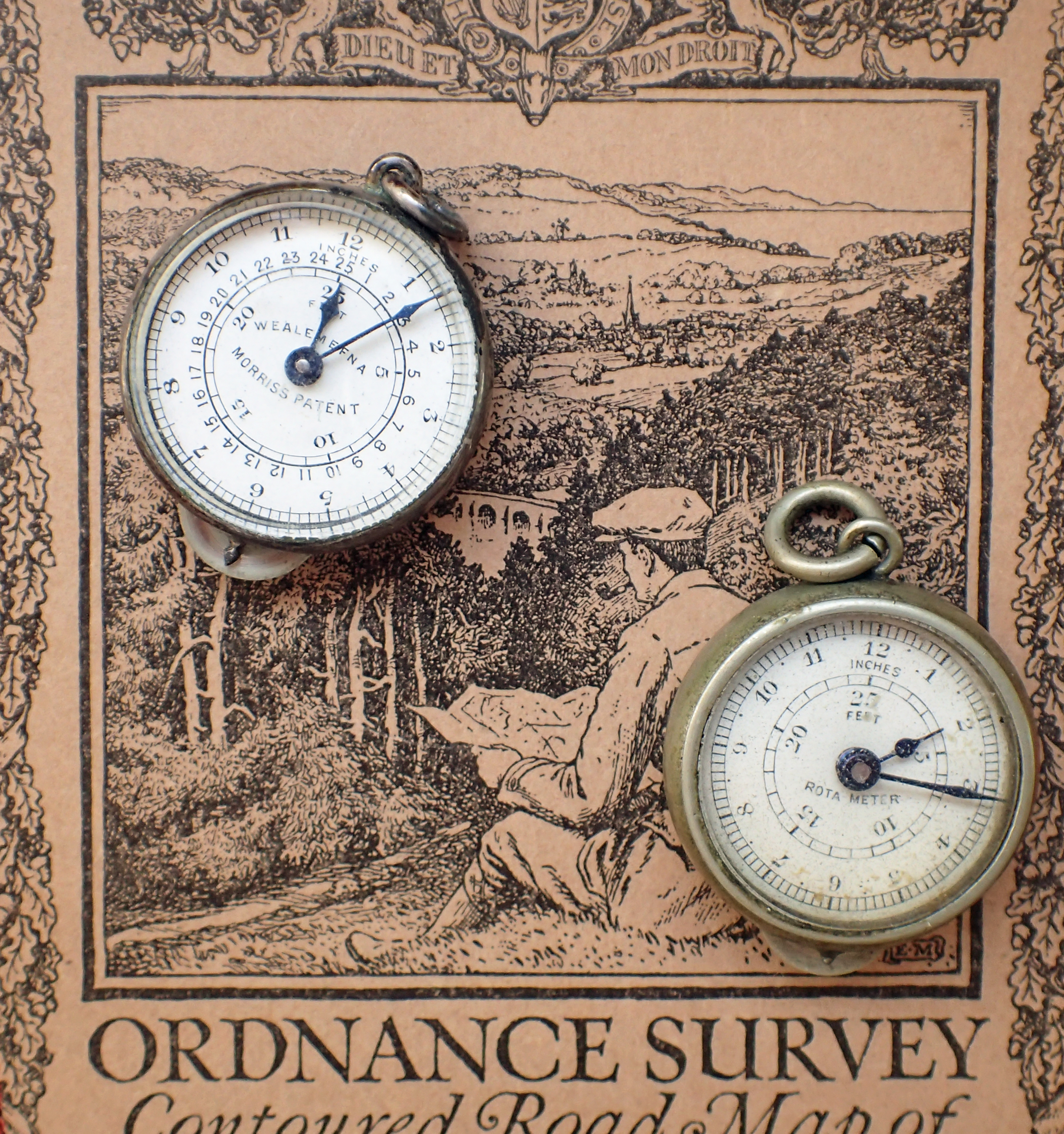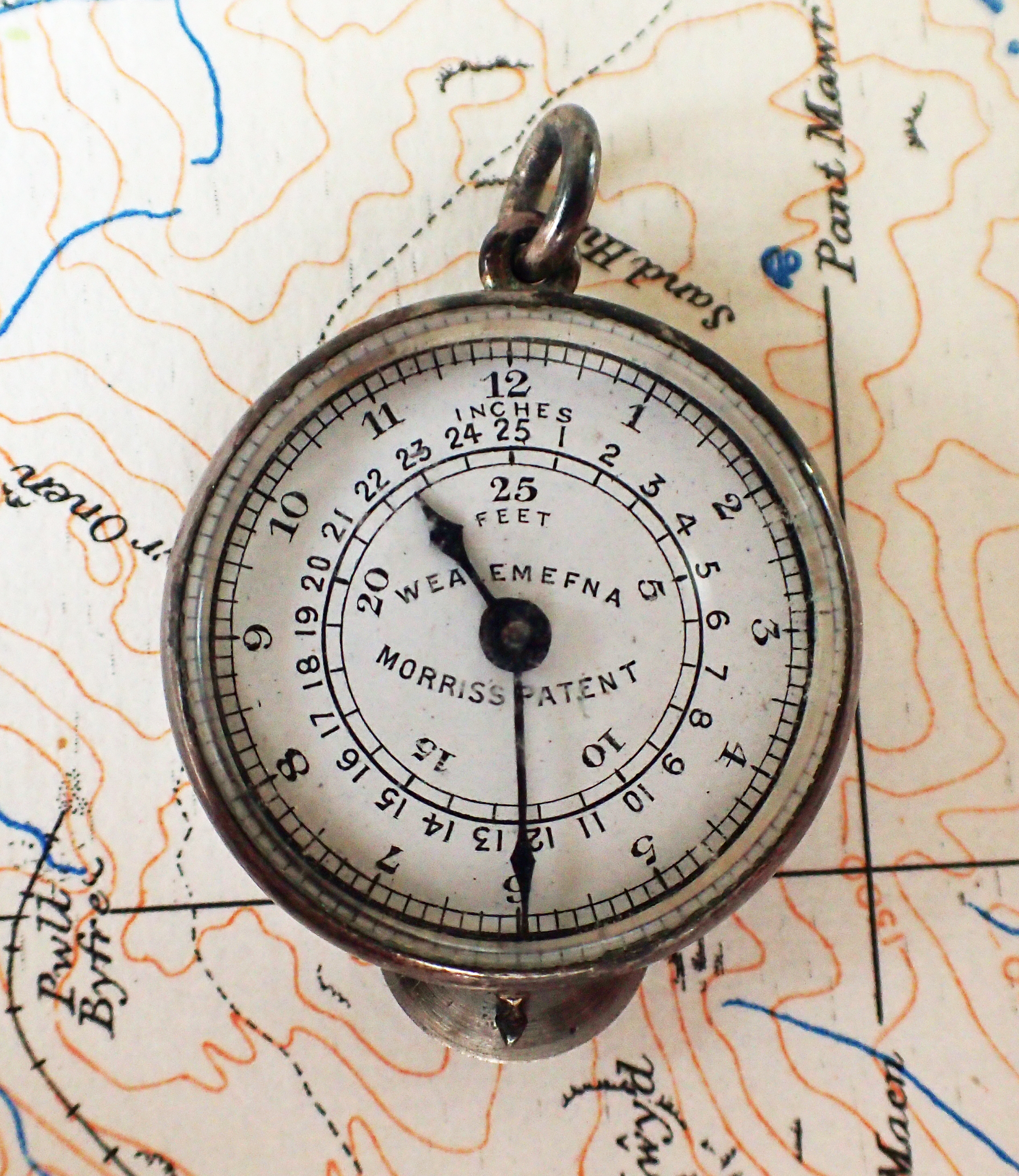Morris was a member of the Institute of Civil Engineers from 1880 and designed and manufactured map measurers in a range of sizes, this is the smallest. The Wealemefna weighs just 15g. Exactly the same as a similar dimensioned Rota-Meter measurer produced by Barker and Son just a few years later. Morris also produced a metric version of the Wealemefna, that he called the Cartomètrè. Both this and the Rota-Meter have also appeared as ‘map measure of the month’. I shall look at the even smaller Bijou version in the future.