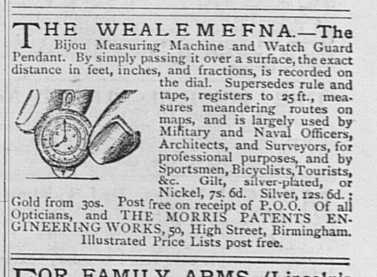 “Mr. Morris has invited our inspection of several forms of his ingenious little mysteriously-named measurer, and though it is late in the day to call attention to it—and probably unnecessary—we may just say that it is a most handy and accurate companion. Its inventor has recently brought out a miniature form of the instrument, which registers up to 10ft., and maу be carried in the waistcoat pocket, or worn as a watchguard-pendant”