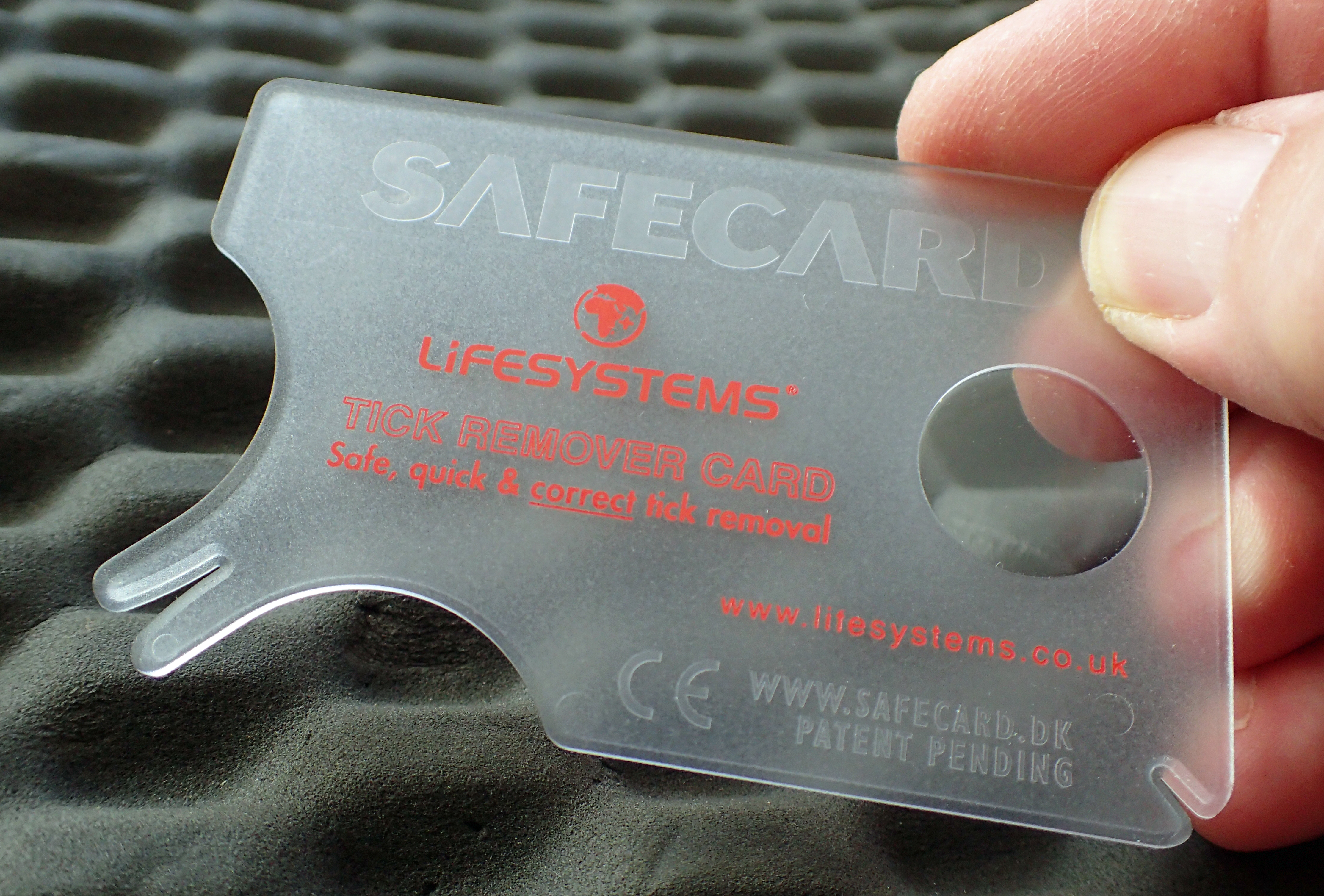 As well as tweezers, some outdoor suppliers also provide tick remover cards. These can be made of durable plastic or shorter lived card versions. If you are going to use one of these, only use a more durable plastic card and preferably from a reputable manufacturer who has made it to the required precise tolerances. Most cards come with two sizes of ‘prong’, one for large and one for small ticks. The transparent and translucent cards are better to see a tick that is to be removed. My credit-card sized Lifesystems tick card also has a simple low powered magnifier to enable a tick to be studied prior to removal, it is obviously of no use when the card is actually being used to remove tick. Do not get a black or dark coloured card as this makes the tick harder to see while extracting it.