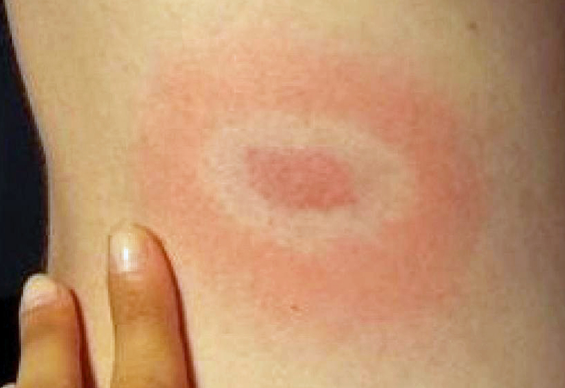 Classic ‘bulls eye’ rash following an infected tick bite, however such rashes do not always occur. Image copyright Lyme Disease Action