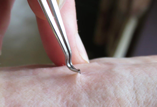Three Points of the Compass doesn’t particularly rate this type of small tweezer highly for tick removal; they will work fine with larger ticks and are also OK with thorns and splinters, but I find the tips are not fine enough to properly anchor onto the mouth-parts of a small tick.