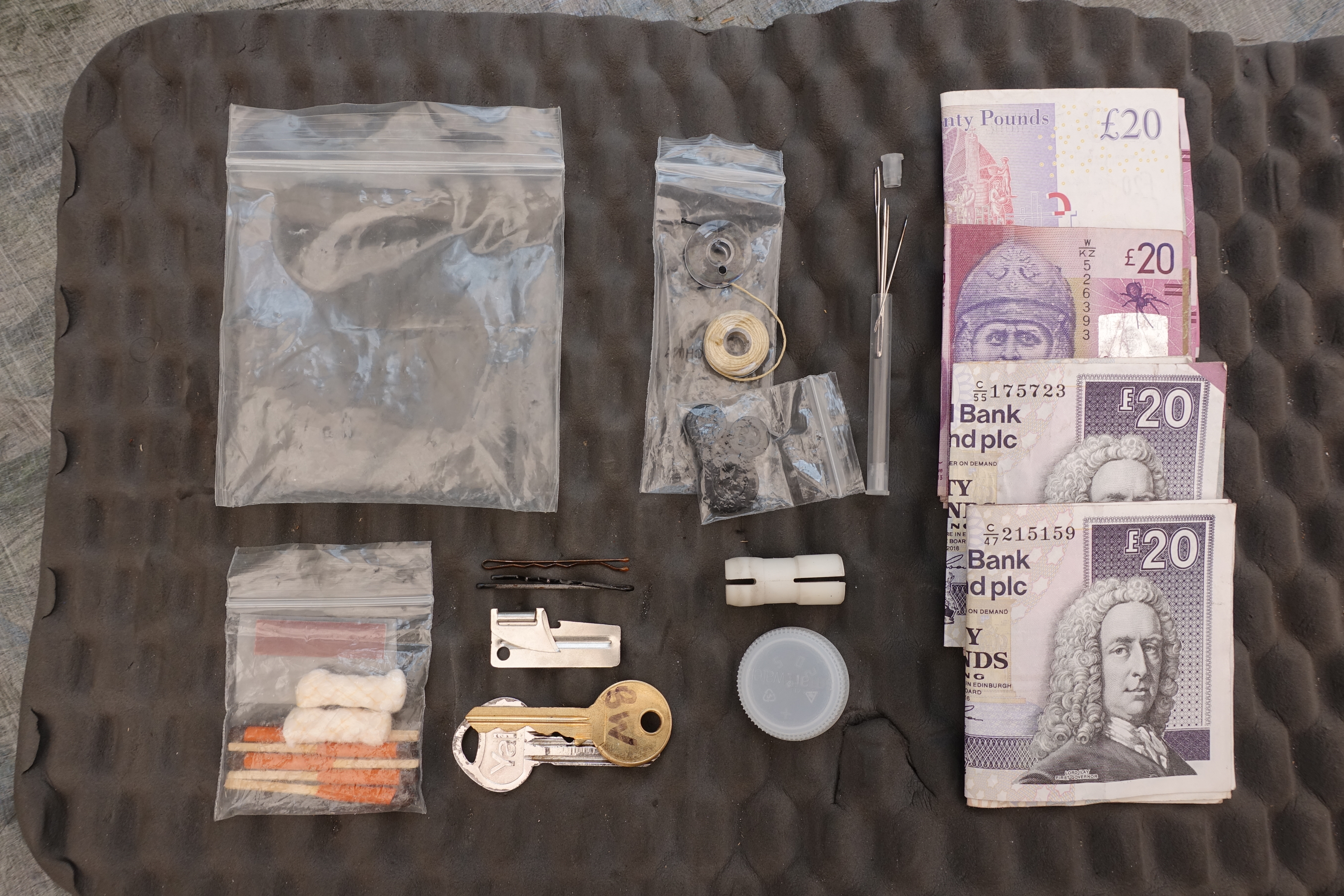 Some of the contents of my backpacking ditty bag- Money, sewing kit, house key and British Waterways water key, emergency fire starter kit, spare water bottle cap, hair grips, to be used as clothes pegs, and a small tin opener