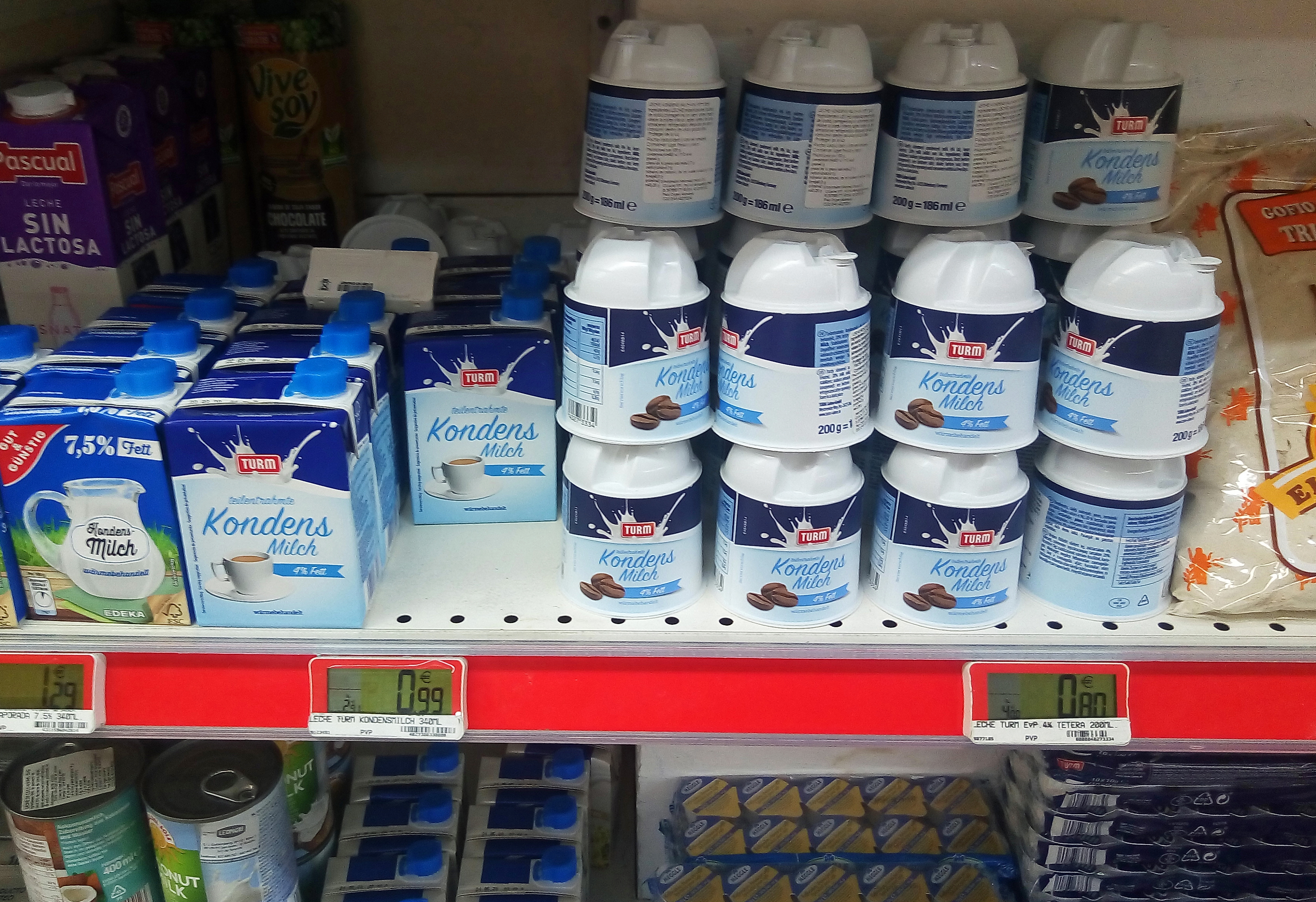 Condensed milk, in various containers, is usually found on supermarket shelves beside packs of gofio. Gran Canaria