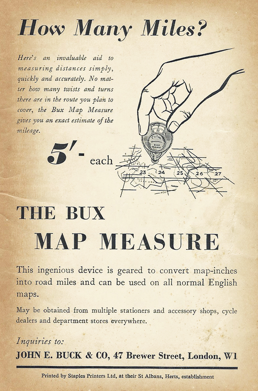 So why is the measure called the ‘Bux’. Little survives today on the origins of this little map measurer but I recently came across an advertisement for the measure in a guide book published circa 1955. This provides us with the name of the supplier and possible manufacturer- John E. Buck & Co, 47 Brewer Street, London, W1. We are informed that the measure was available from- “multiple stationers and accessory shops, cycle dealers and department stores everywhere”.