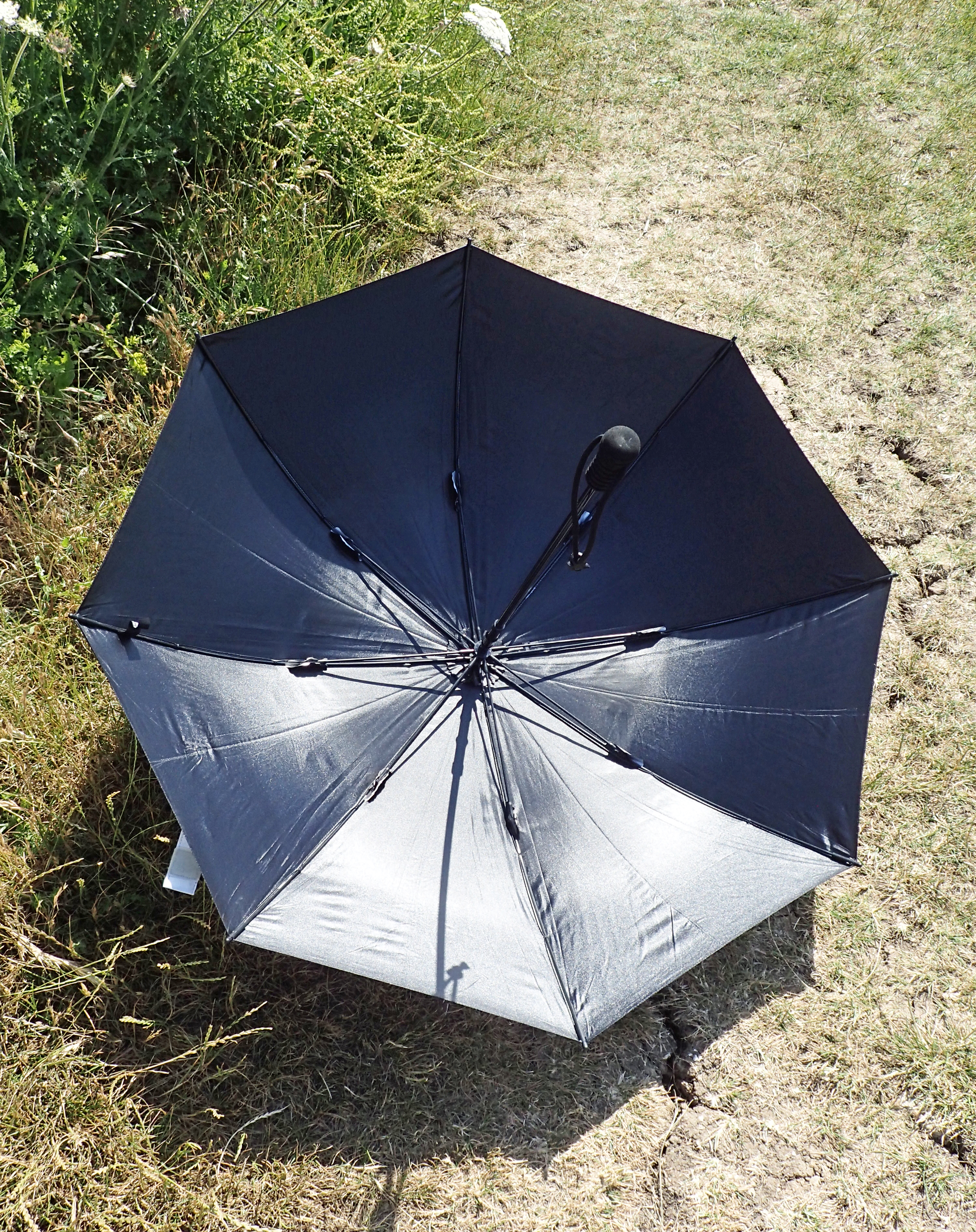 The umbrella is a metre wide and provides total shade to head, shoulders and top of upper body. I haven’t carried a thermometer with me to accurately measure, but on a recent day hike, on an exposed section of seawall, the sun in a cloudless sky and measuring 32°C (89.60 °F), I would guess it was between five and ten degrees cooler beneath the umbrella.