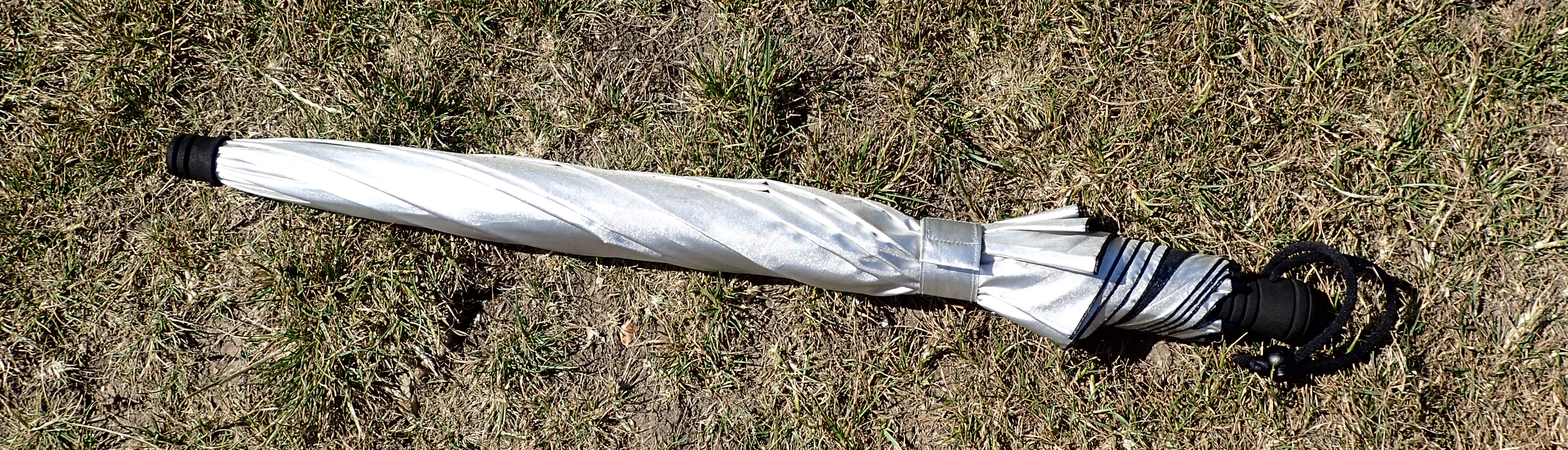 The Euroschirm range includes trekking, golf and city umbrellas. The trekking collection includes fixed length and collapsible umbrellas in a wide range of colours. I purchased the Swing Liteflex. This a fixed length umbrella that cannot collapse. While this means that it has a length that constantly has to be contended with, there is less to go wrong and break, and less moving parts so less weight. There are no metal parts to this umbrella at all. There are no clips to the opening/closing mechanism, it simply slides and locks into place under tension. The umbrella has a fibreglass shaft and ribs. Covering the ribs is a Teflon coated polyester canopy. It has a short, dense EVA foam handle with a short adjustable wrist loop. My canopy is a silver metallic outer that reflects sunlight, with a dark interior. This has a UV protection of UPF 50+. The classic hiking umbrella for many years in US circles was the Golite ‘Chrome Dome’. More recently, other US companies also advertise their own variants. Almost all of these are actually the umbrella that I have purchased, made by Euroschirm, and simply re-branded with their company logo. There are eight ribs on my model, this gives greater strength over the six ribbed models also available.