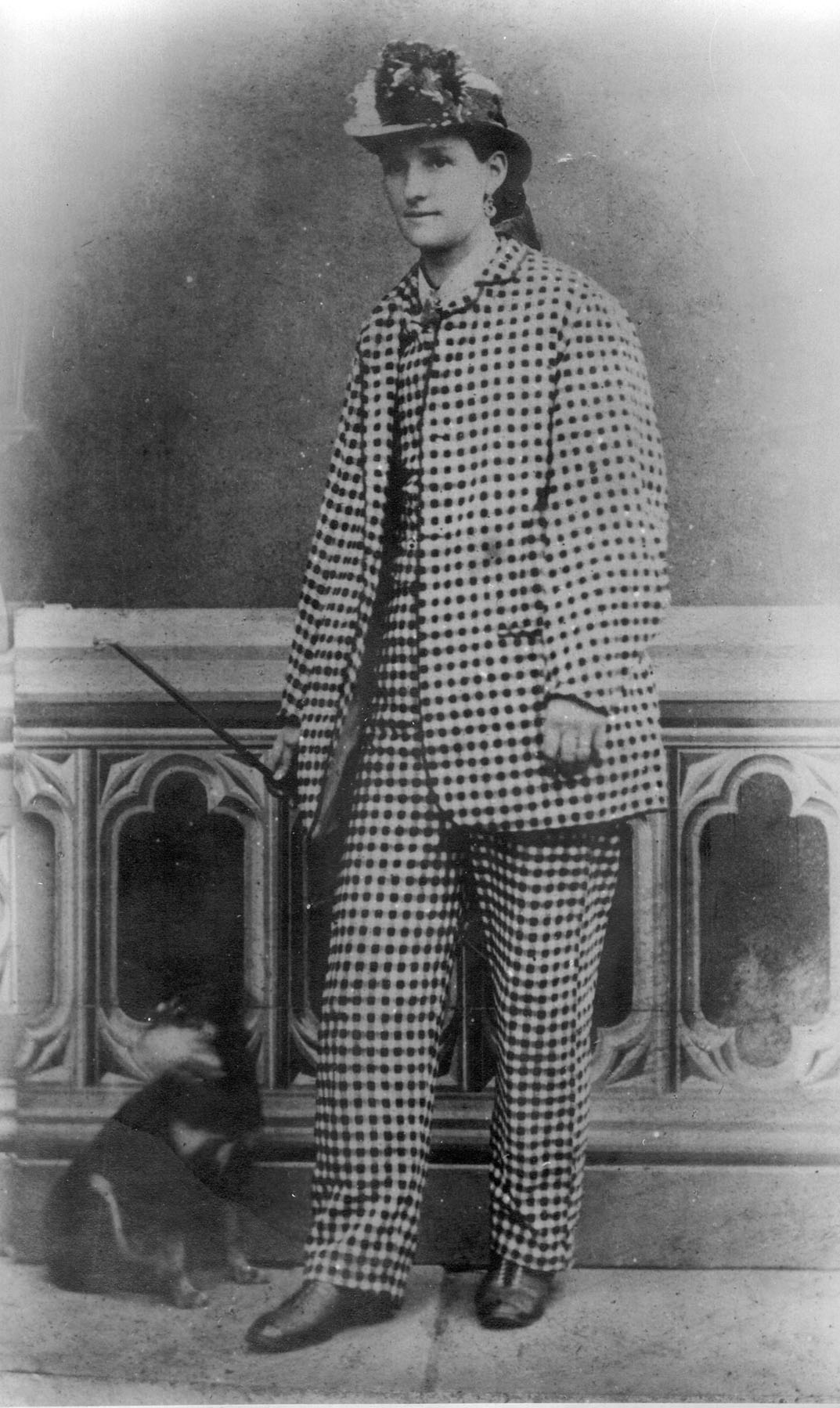 Emma Sharp dressed in her 1000 mile attire, reported as- “male clothing with the exception of her straw hat which was adorned with ‘feminine ornaments'”, 1864