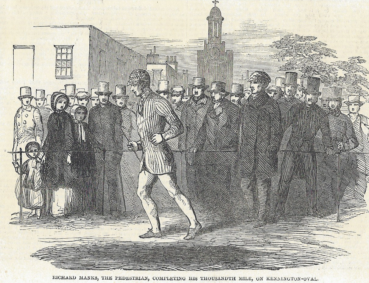 Richard Manks was the second person to walk a thousand miles in a thousand hours, completing his feat in the year of the Great Exhibition, at the Surrey Cricket Ground. Illustrated London News, 8 November 1851
