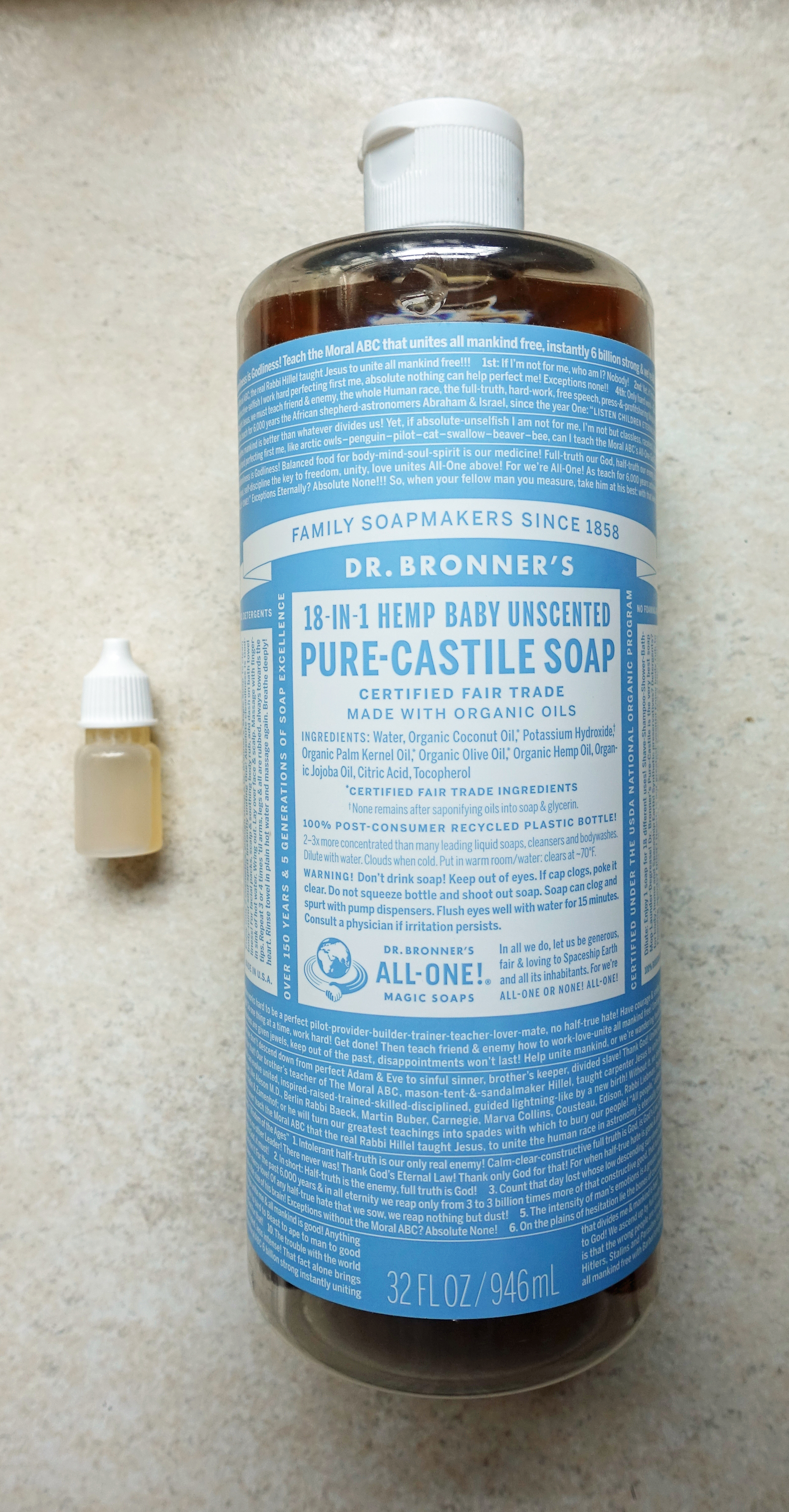 I have tried soap leaves in the past but found they eventually get damp and turn to frothy mush. The solid bars of soap and solid shower bars from Lush are pleasant and effective but pretty heavy. Most often these days I simply carry a tiny dropper bottle of liquid castile soap. This is a vegetable based soap that comes in solid or liquid form and is extremely concentrated.