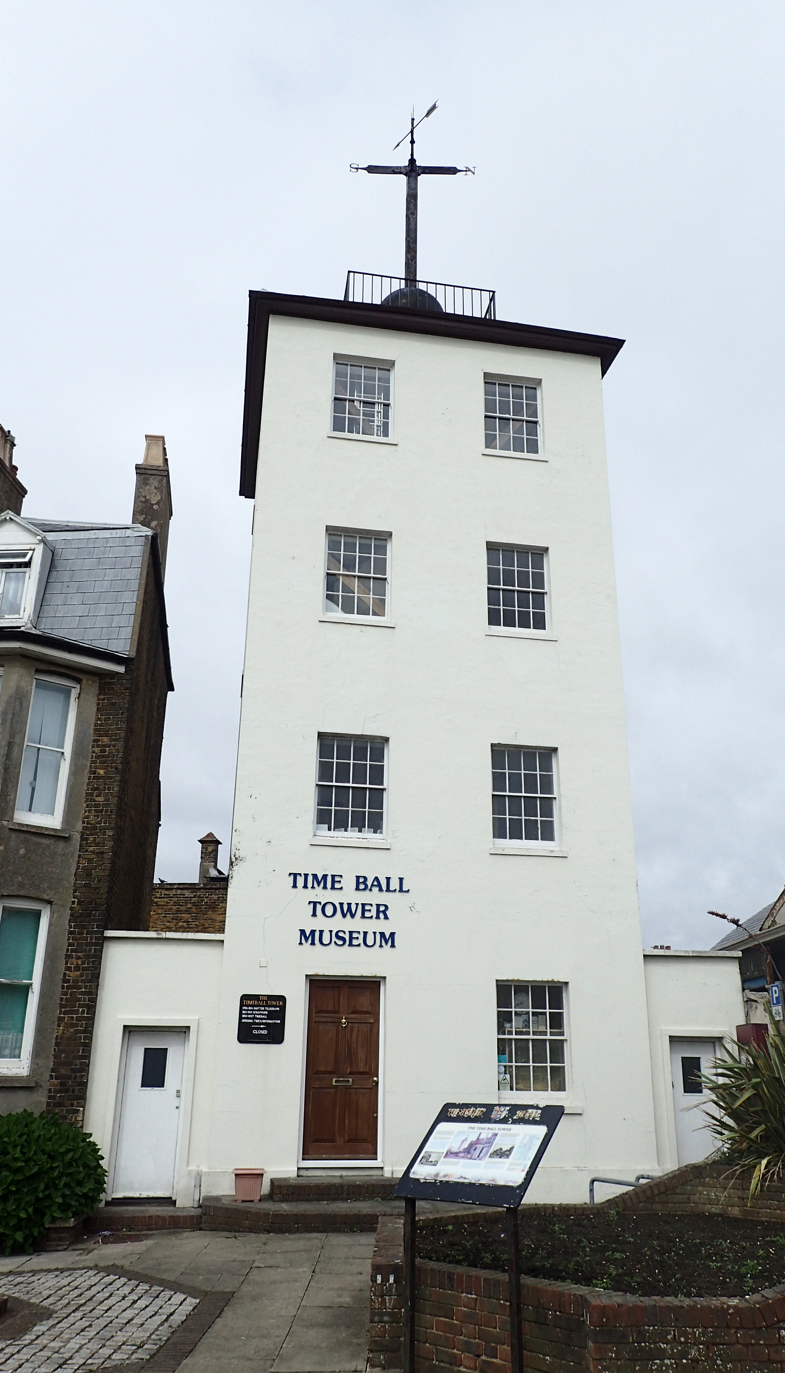 Deal Time Ball Tower. Built as a shutter telegraph in 1795-6, a message from here could reach the Admiralty in London in two minutes. Rebuilt as a semaphore tower in 1816, it was again rebuilt as a time-ball tower in 1833. At 12.55 a ball was raised half way up the mast and to the top at 12.58. At 13.00 an electrical current from Greenwich dropped the ball, enabling ships off shore to properly set their chronometers