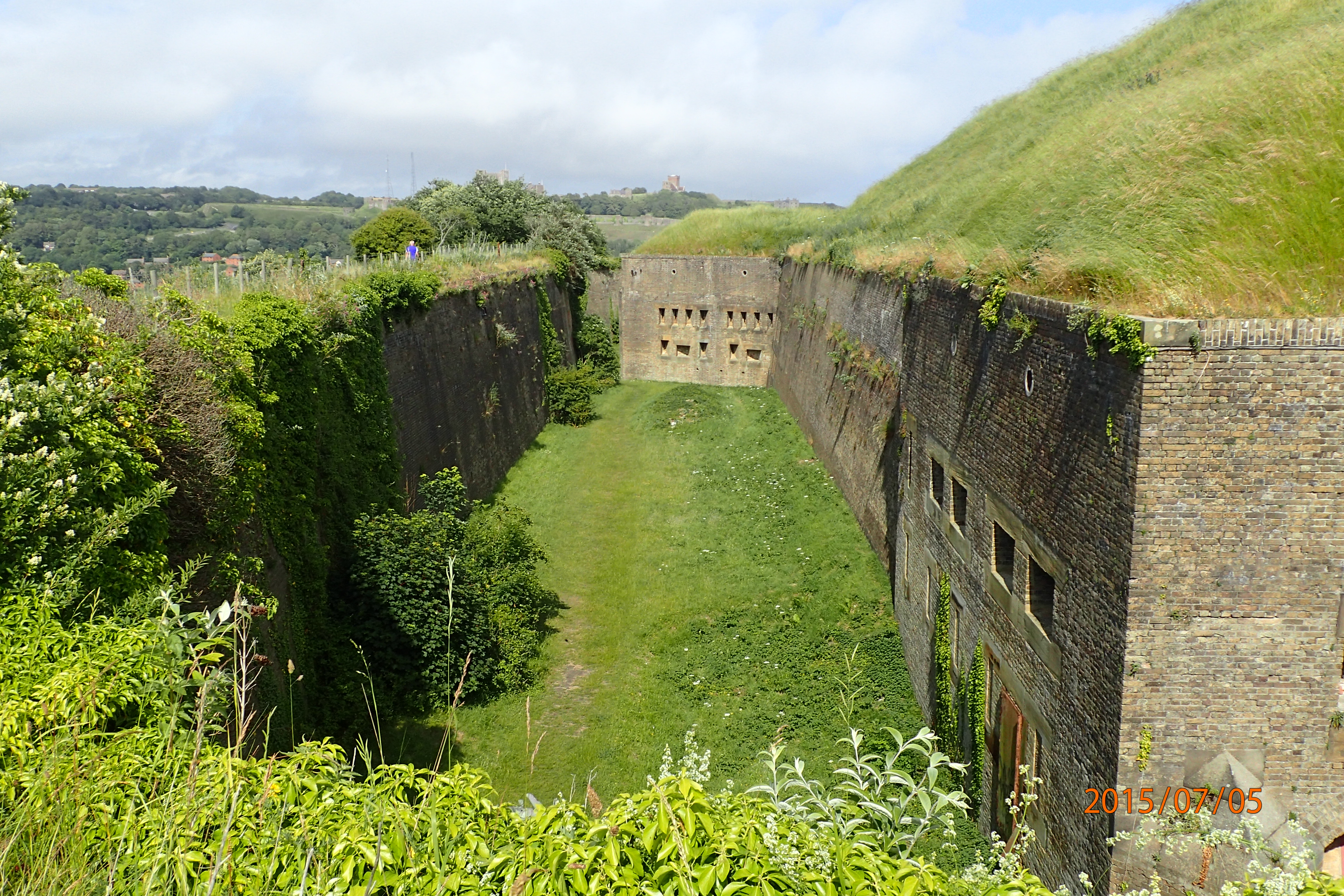 Part of the impressive Drop Redoubt of the Napoleonic Western Heights is passed by the Saxon Shore Way on the cliffs above Dover. Photographed by Three Points of the Compass when completing the North Downs Way in July 2015